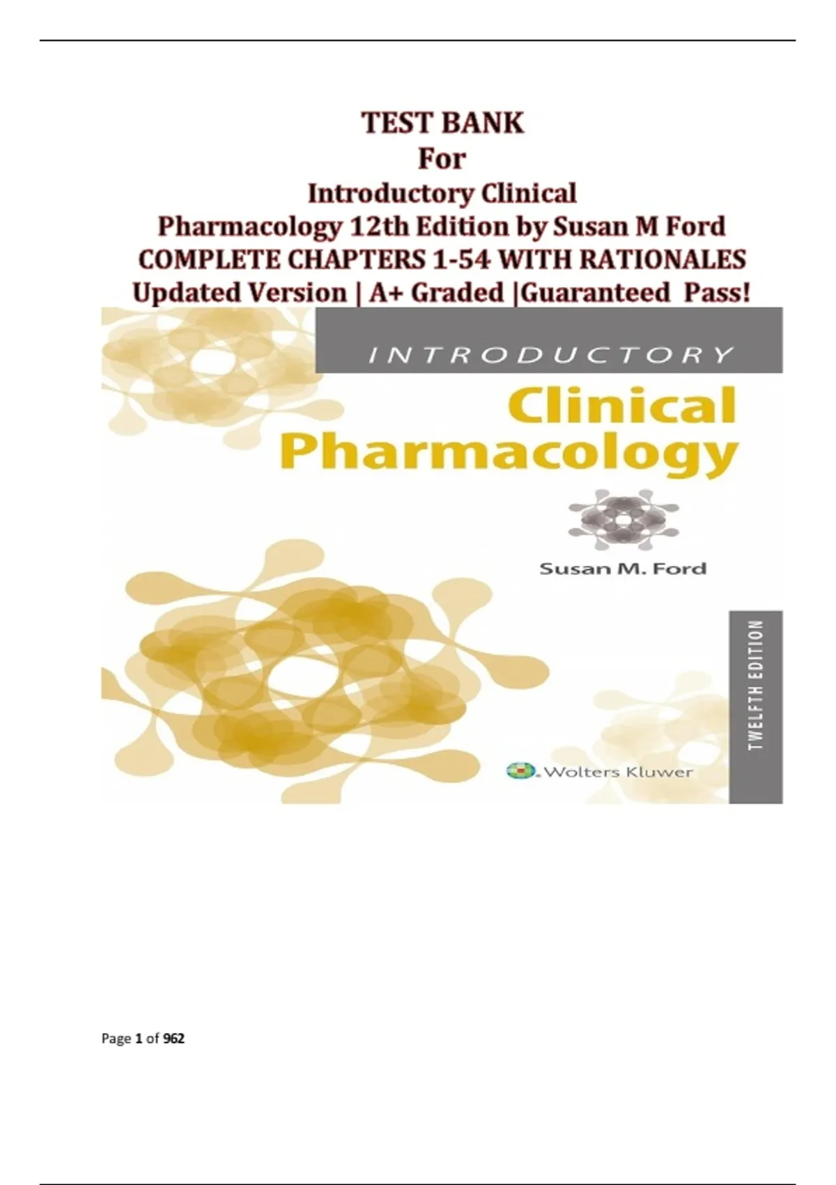 This document contains the complete test bank for Introductory Clinical Pharmacology, 12th Edition by Susan M. Ford. It includes multiple-choice, select-all-that-apply, and case-based questions with correct answers and rationales. Topics are organized by units covering the nursing foundation of pharmacology, drug administration and safety, pharmacokinetics, client and family teaching, antimicrobial drugs, pain management, central and peripheral nervous system agents, respiratory, cardiovascular, gastrointestinal, endocrine, urinary, and immune system drugs, as well as cancer therapies and drugs for special populations. The material is structured to reinforce core concepts of safe medication practices and prepare nursing students for exams.