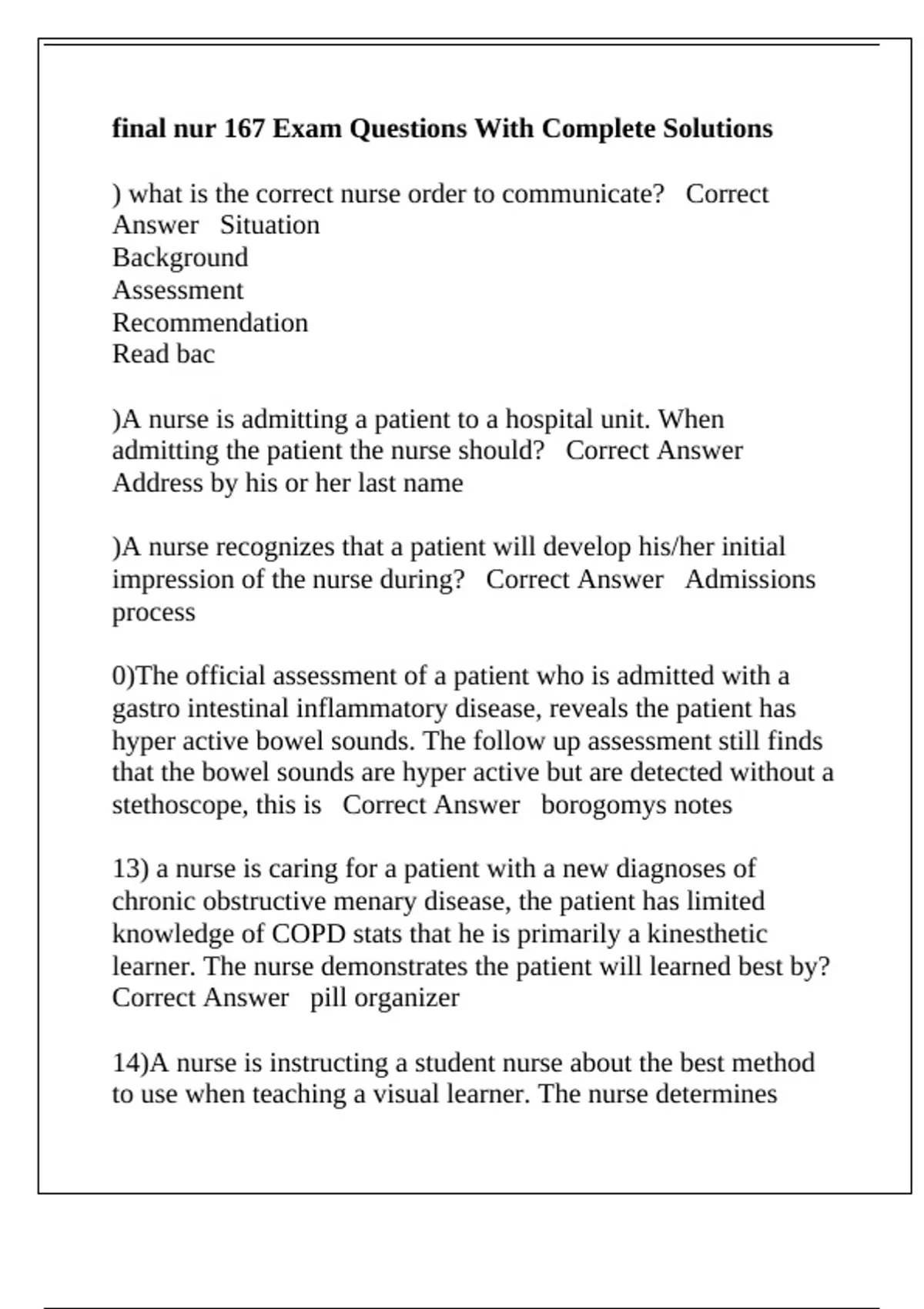 final nur 167 Exam Questions With Complete Solutions