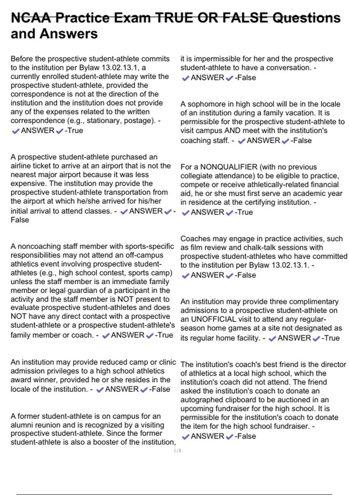, NCAA Practice Exam TRUE OR FALSE Questions