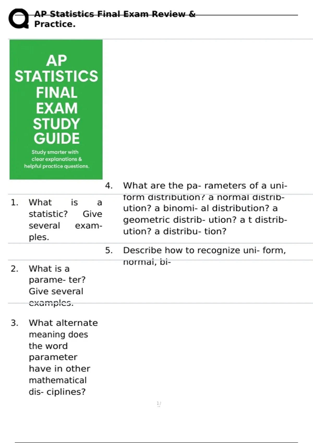 Get ready to ace your AP Statistics Final Exam with this comprehensive, student‑friendly study guide. This resource is designed to help you review essential concepts, practice problem‑solving skills, and build confidence before test day. Covering key topics from probability and data analysis to statistical inference, it offers clear explanations, helpful tips, and targeted practice questions. Whether you’re preparing weeks in advance or doing a last‑minute review, this guide will help you study smarter and perform your best on the AP Statistics Final Exam.
