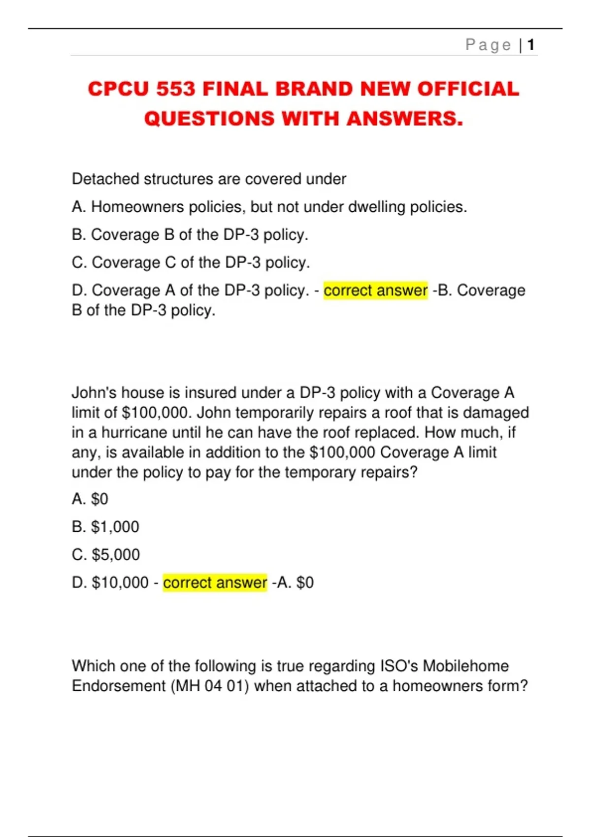 D. Coverage A of the DP-3 policy. - correct answer -B. Coverage