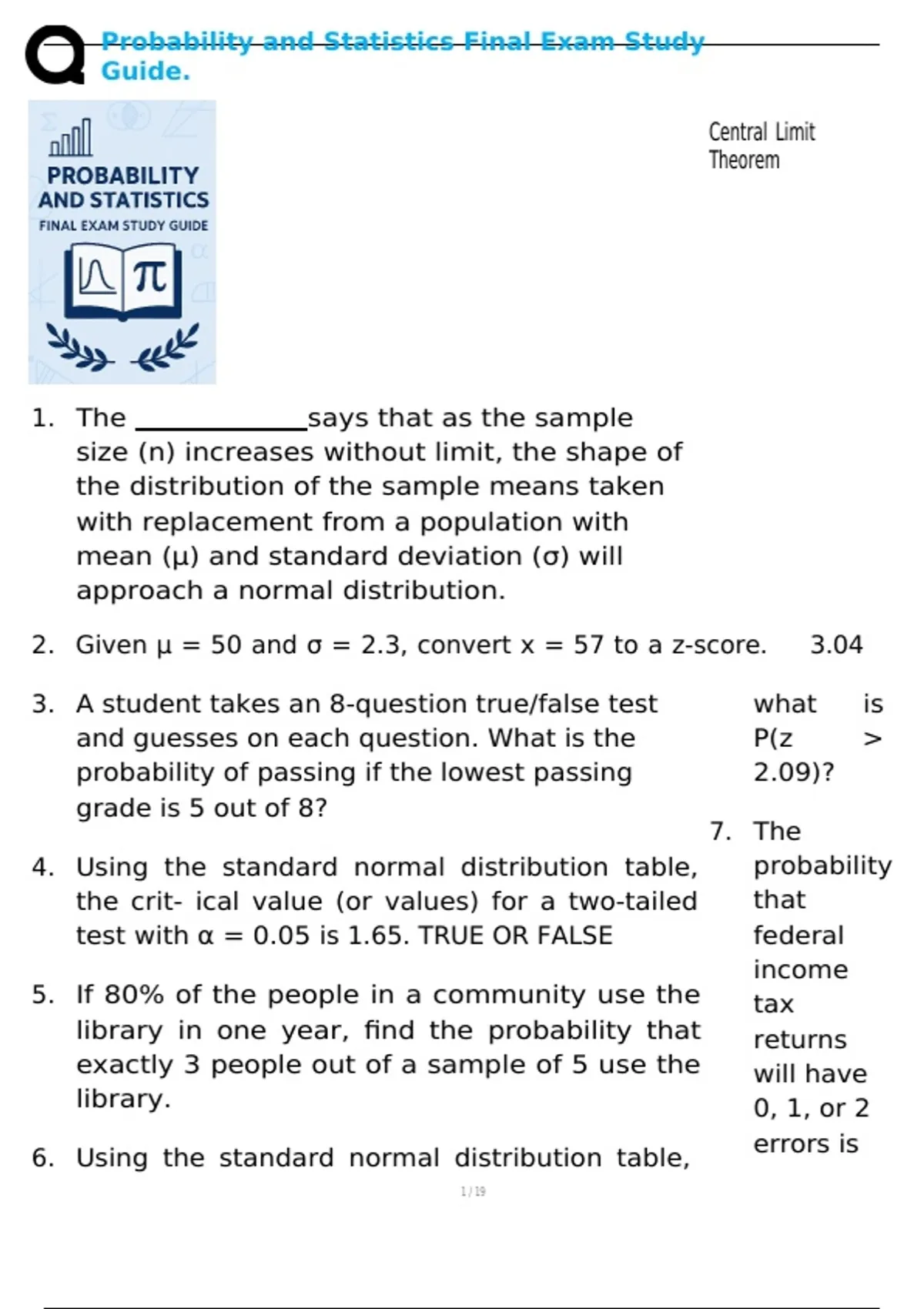 , Probability and Statistics Final Exam Study