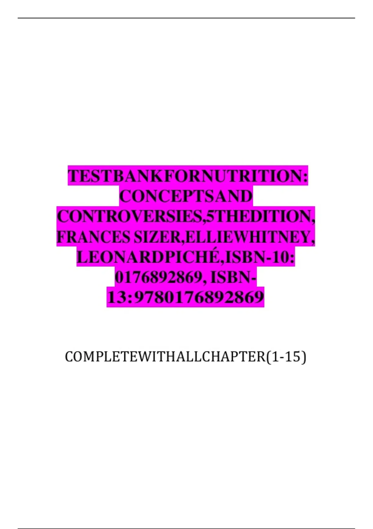 TEST BANK For Nutrition: Concepts and Controversies, 5th Edition by Sizer & Whitney, All 15 Chapters Covered, Verified Latest Edition