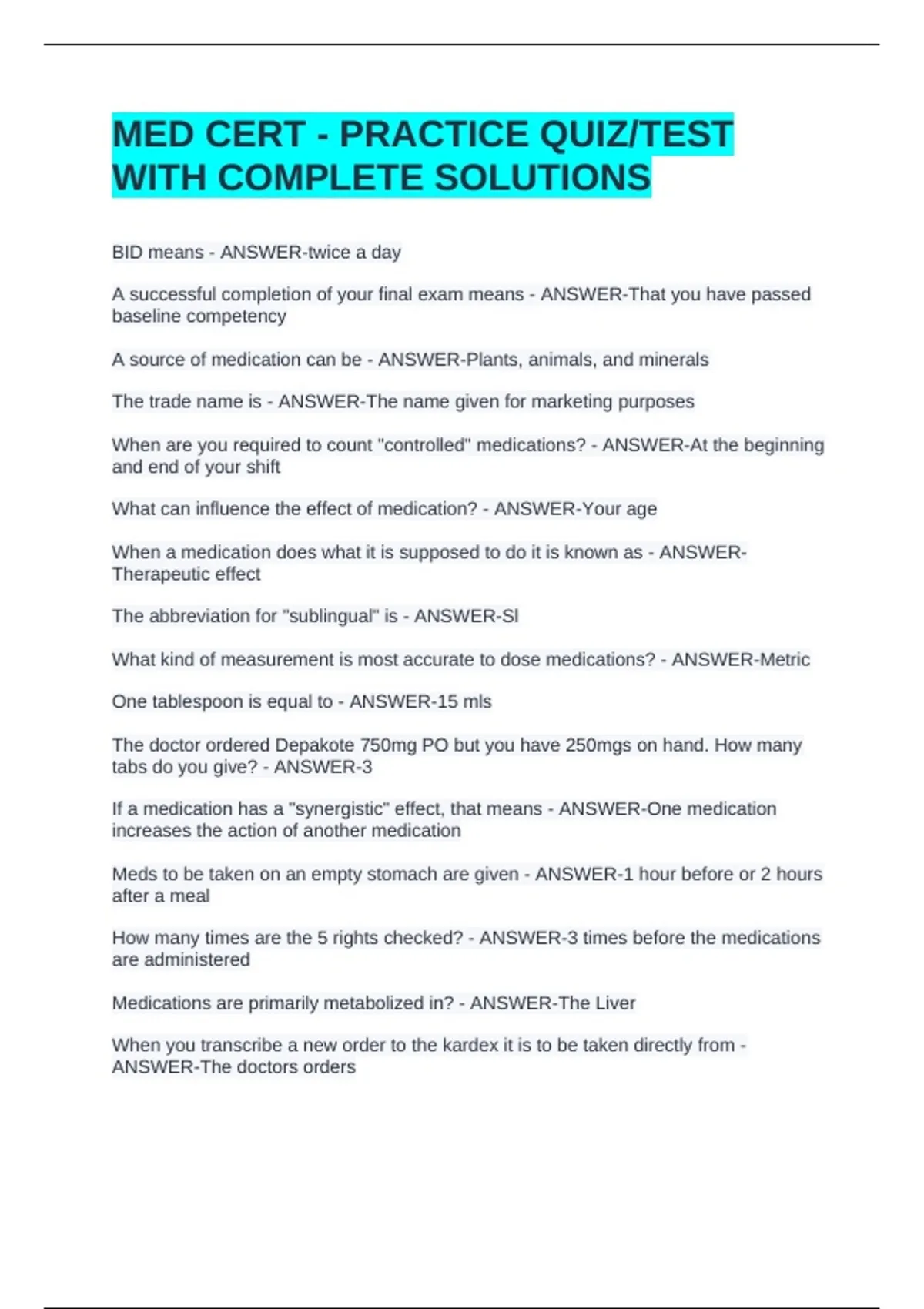MED CERT - PRACTICE QUIZ/TEST WITH COMPLETE SOLUTIONSMED CERT - PRACTICE QUIZ/TEST WITH COMPLETE SOLUTIONSBID means - ANSWER-twice a day A successful completion of your final exam means - ANSWER-That you have passed baseline competency A source of medication can be - ANSWER-Plants, animals, and minerals The trade name is - ANSWER-The name given for marketing purposes