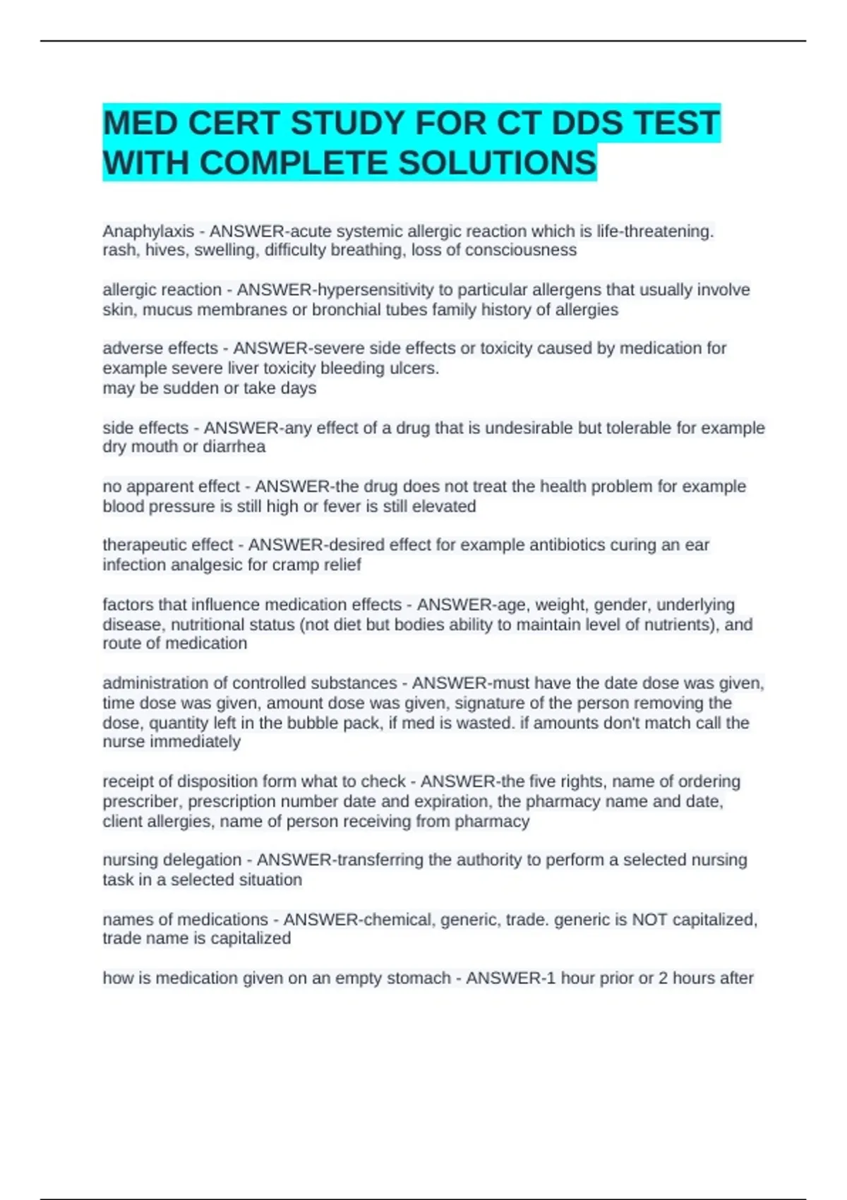 MED CERT STUDY FOR CT DDS TEST WITH COMPLETE SOLUTIONSMED CERT STUDY FOR CT DDS TEST WITH COMPLETE SOLUTIONSMED CERT STUDY FOR CT DDS TEST WITH COMPLETE SOLUTIONS Anaphylaxis - ANSWER-acute systemic allergic reaction which is life-threatening. rash, hives, swelling, difficulty breathing, loss of consciousness allergic reaction - ANSWER-hypersensitivity to particular allergens that usually involve skin, mucus membranes or bronchial tubes family history of allergies adverse effects - ANSWER-severe side effects or toxicity caused by medication for example severe liver toxicity bleeding ulcers. may be sudden or take days side effects - ANSWER-any effect of a drug that is undesirable but tolerable for example dry mouth or diarrhea