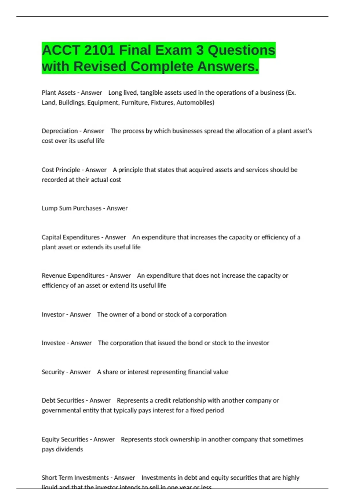 Plant Assets - Answer Long lived, tangible assets used in the operations of a business (Ex.