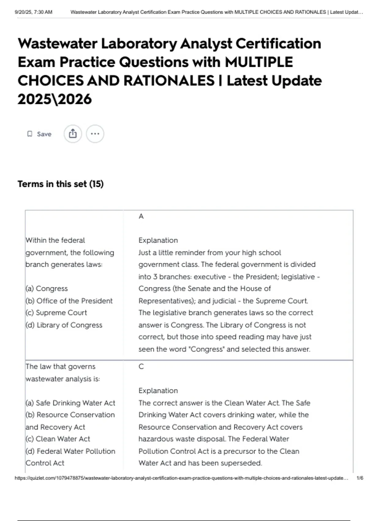 , 9/20/25, 7:30 AM Wastewater Laboratory Analyst Certification Exam Practice Questions with MULTIPLE CHOICES AND RATIONALES | Latest Updat…