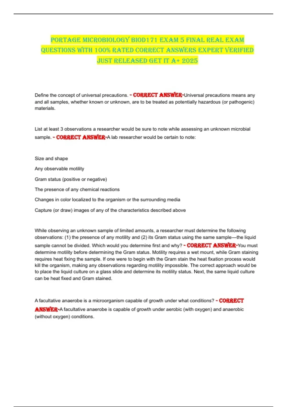 PORTAGE MICROBIOLOGY BIOD171 EXAM 5 FINAL REAL EXAM QUESTIONS WITH 100% RATED CORRECT ANSWERS EXPERT VERIFIED JUST RELEASED GET IT A+ 2025
