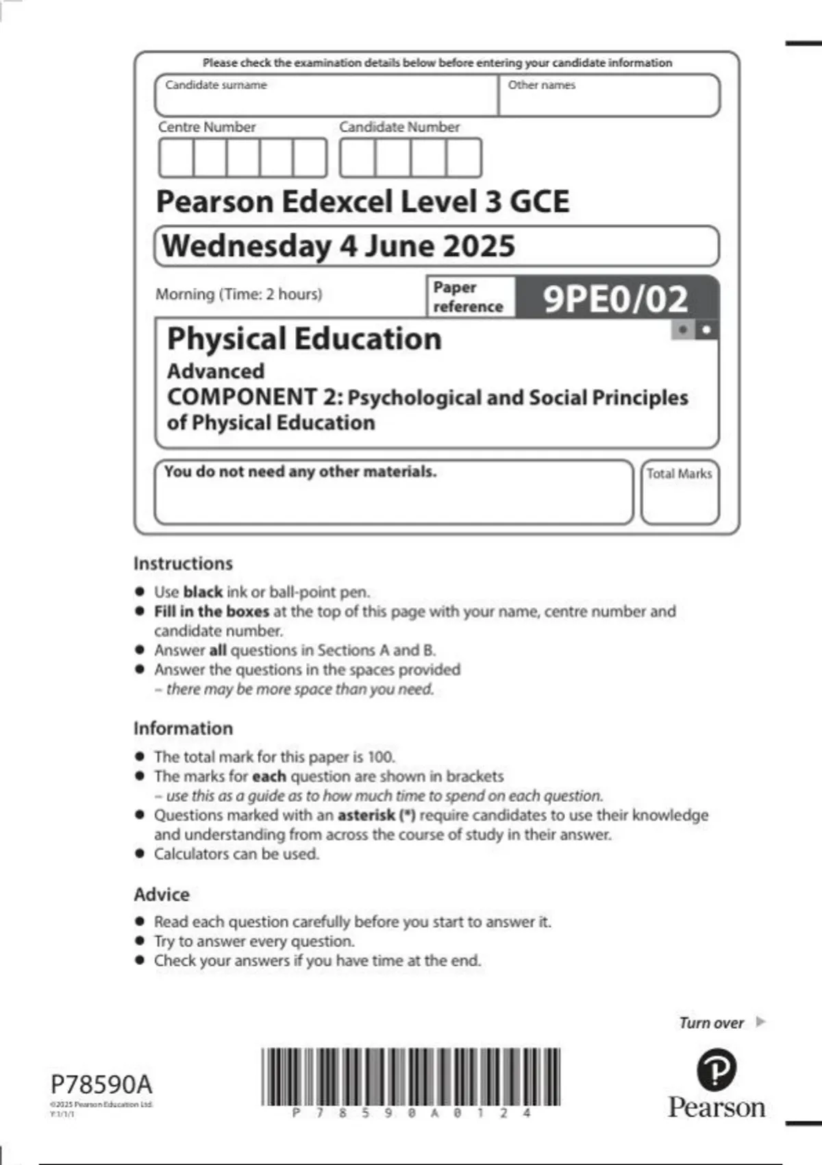 EDEXCEL advanced level in physical education 9pe0-02 psychological and social principles of physical education june-2025.