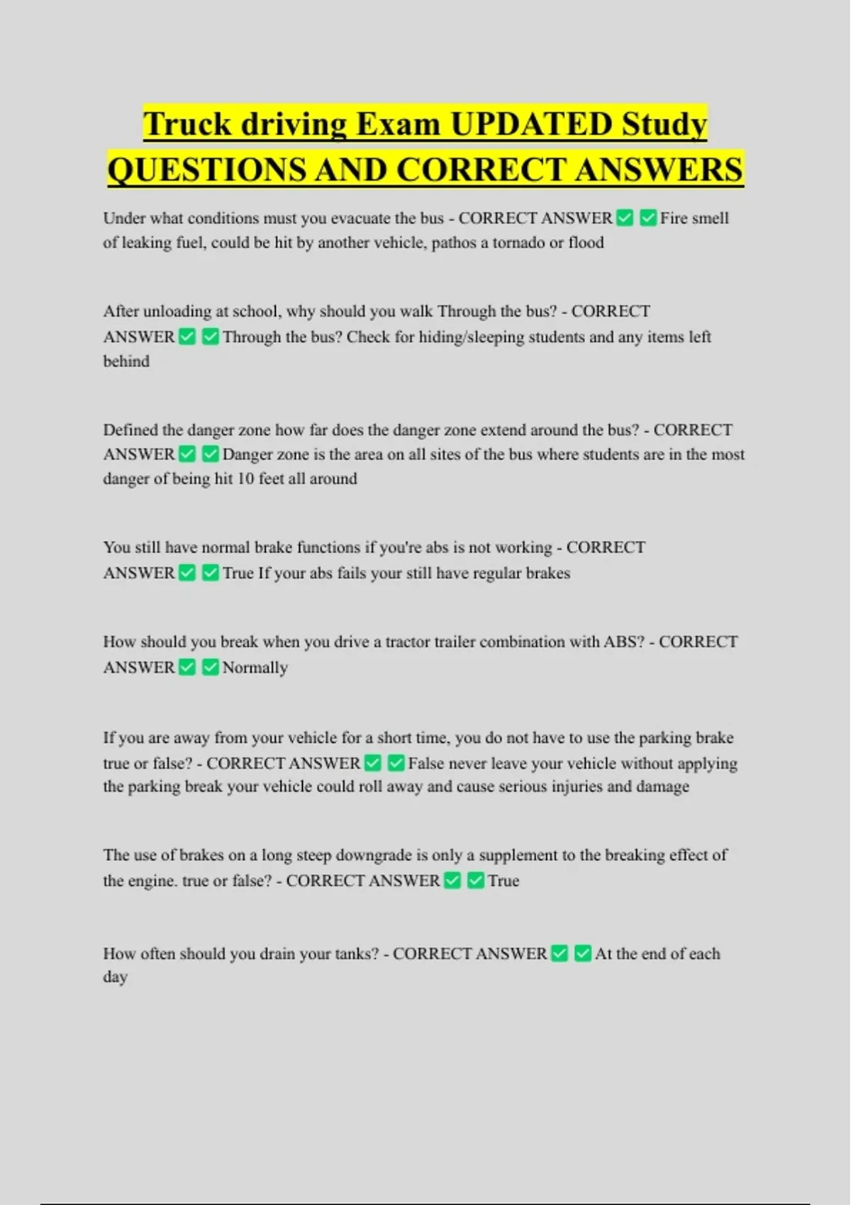 Truck driving Exam UPDATED Study QUESTIONS AND CORRECT ANSWERS Under what conditions must you evacuate the bus - CORRECT ANSWER of leaking fuel, could be hit by another vehicle, pathos a tornado or flood After unloading at school, why should you walk Through the bus? - CORRECT ANSWER Fire smell Through the bus? Check for hiding/sleeping students and any items left behind Defined the danger zone how far does the danger zone extend around the bus? - CORRECT ANSWER Danger zone is the area on all sites of the bus where students are in the most danger of being hit 10 feet all around