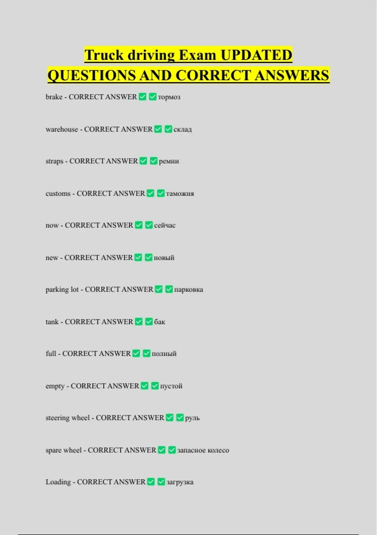 Truck driving Exam UPDATED QUESTIONS AND CORRECT ANSWERS brake - CORRECT ANSWER warehouse - CORRECT ANSWER straps - CORRECT ANSWER customs - CORRECT ANSWER now - CORRECT ANSWER new - CORRECT ANSWER parking lot - CORRECT ANSWER tank - CORRECT ANSWER full - CORRECT ANSWER тормоз склад ремни таможня сейчас новый парковка бак полный