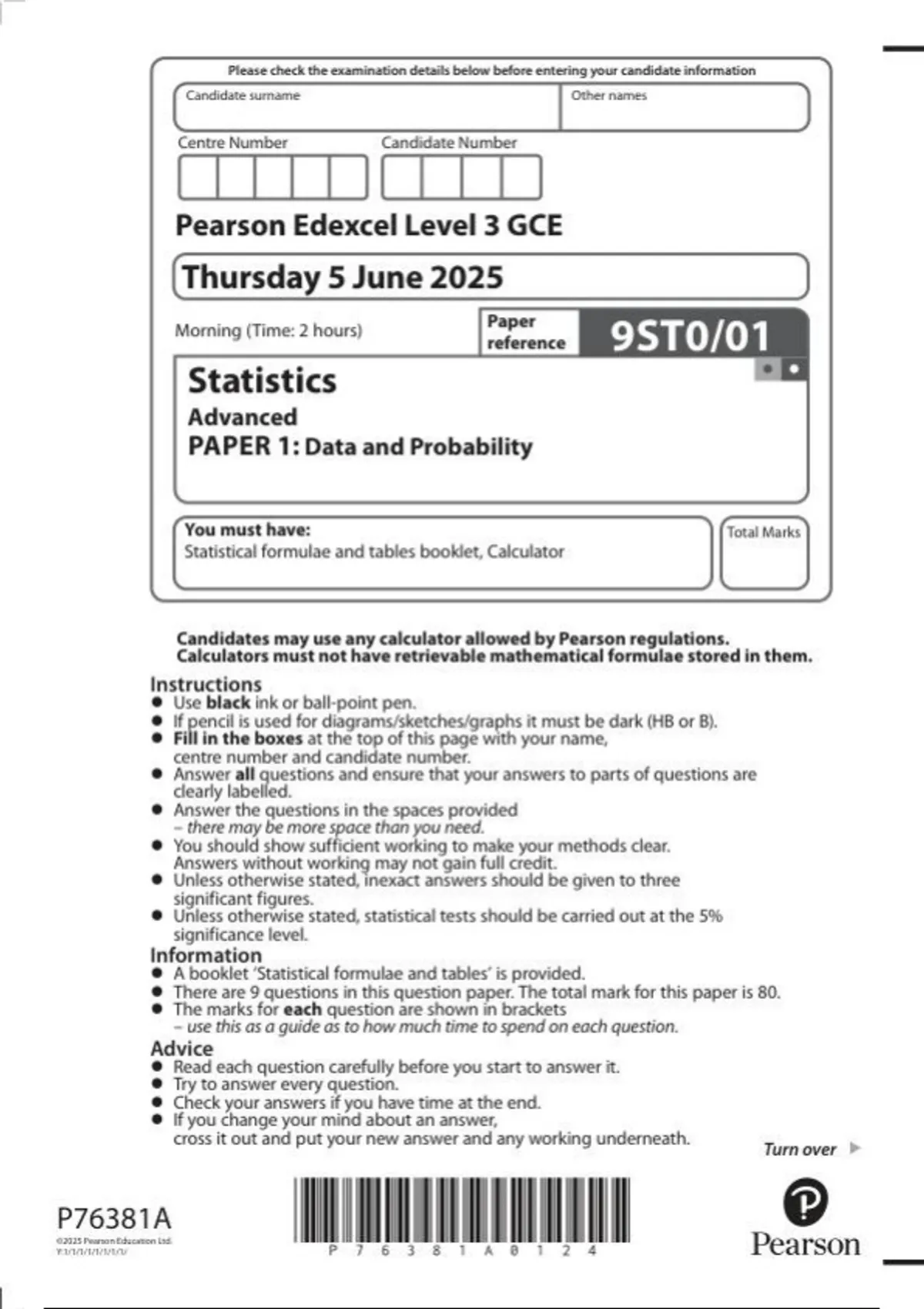 EDEXCEL statistics 9st0-01 paper 1: data and probability june-2025.