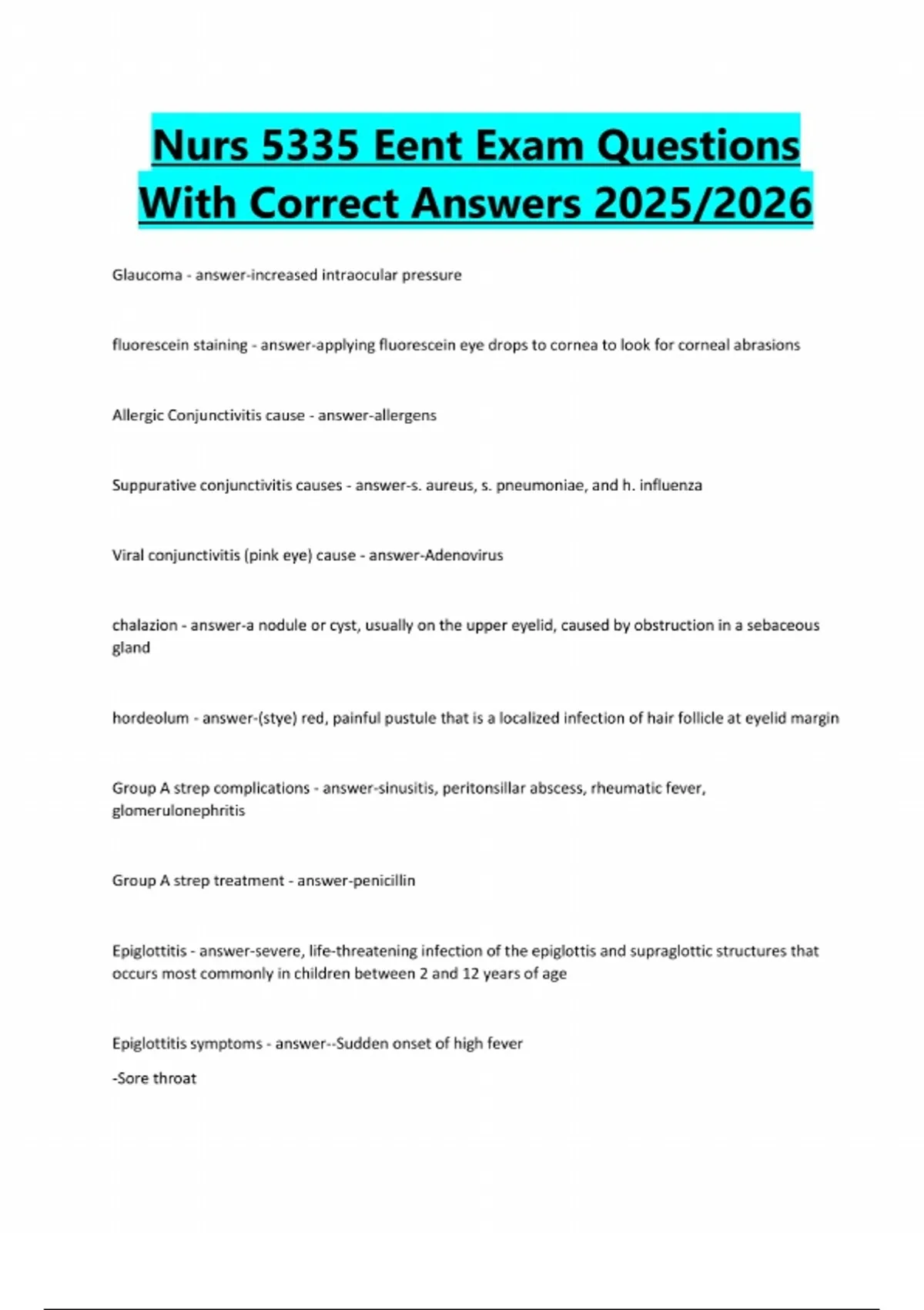 Nurs 5335 Eent Exam Questions With Correct Answers 2025/2026 Glaucoma - answer-increased intraocular pressure fluorescein staining - answer-applying fluorescein eye drops to cornea to look for corneal abrasions Allergic Conjunctivitis cause - answer-allergens Suppurative conjunctivitis causes - answer-s. aureus, s. pneumoniae, and h. influenza Viral conjunctivitis (pink eye) cause - answer-Adenovirus chalazion - answer-a nodule or cyst, usually on the upper eyelid, caused by obstruction in a sebaceous gland hordeolum - answer-(stye) red, painful pustule that is a localized infection of hair follicle at eyelid margin Group A strep complications - answer-sinusitis, peritonsillar abscess, rheumatic fever, glomerulonephritis Group A strep treatment - answer-penicillin Epiglottitis - answer-severe, life-threatening infection of the epiglottis and supraglottic structures that occurs most commonly in children between 2 and 12 years of age Epiglottitis symptoms - answer--Sudden onset of high fever -Sore throat-Drooling -Muffled voice -Stridor -Thumb sign