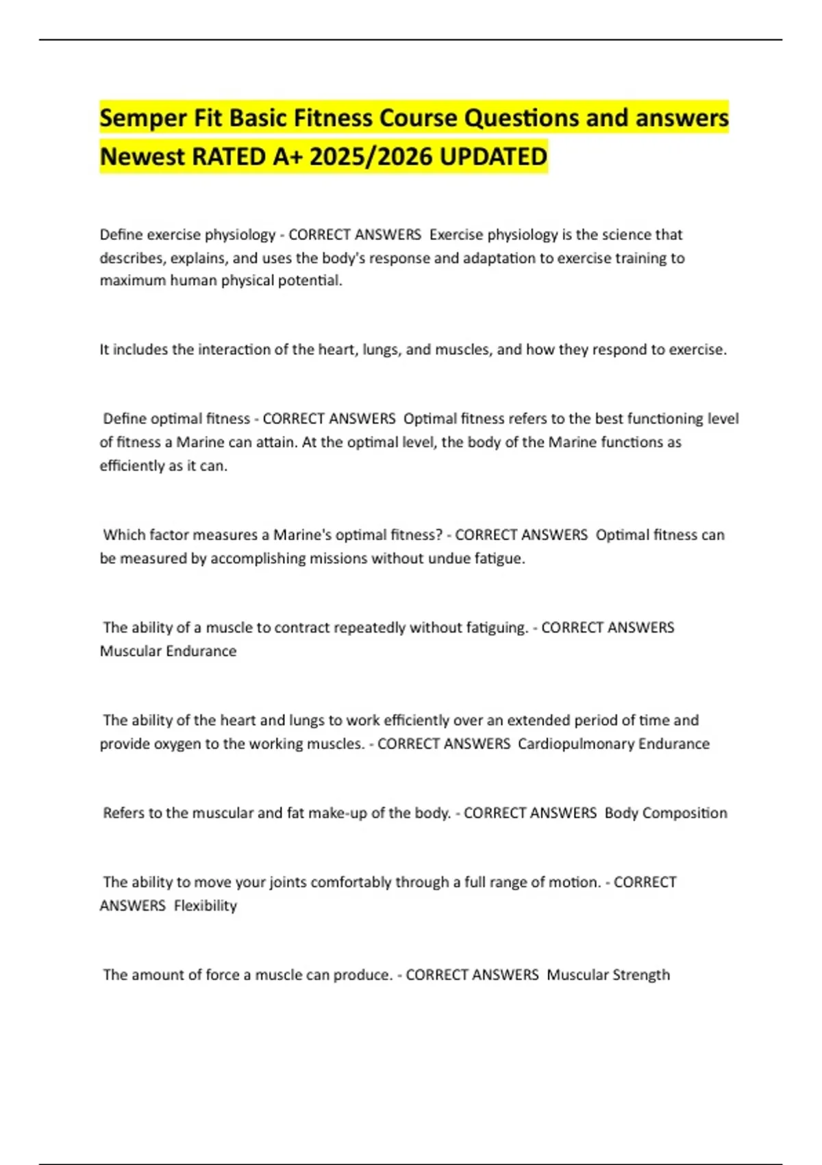 Semper Fit Basic Fitness Course Questions and answers Newest RATED A+ 2025/2026 UPDATEDSemper Fit Basic Fitness Course Questions and answers Newest RATED A+ 2025/2026 UPDATEDSemper Fit Basic Fitness Course Questions and answers Newest RATED A+ 2025/2026 UPDATEDSemper Fit Basic Fitness Course Questions and answers Newest RATED A+ 2025/2026 UPDATEDSemper Fit Basic Fitness Course Questions and answers Newest RATED A+ 2025/2026 UPDATEDSemper Fit Basic Fitness Course Questions and answers Newest RATED A+ 2025/2026 UPDATEDSemper Fit Basic Fitness Course Questions and answers Newest RATED A+ 2025/2026 UPDATED