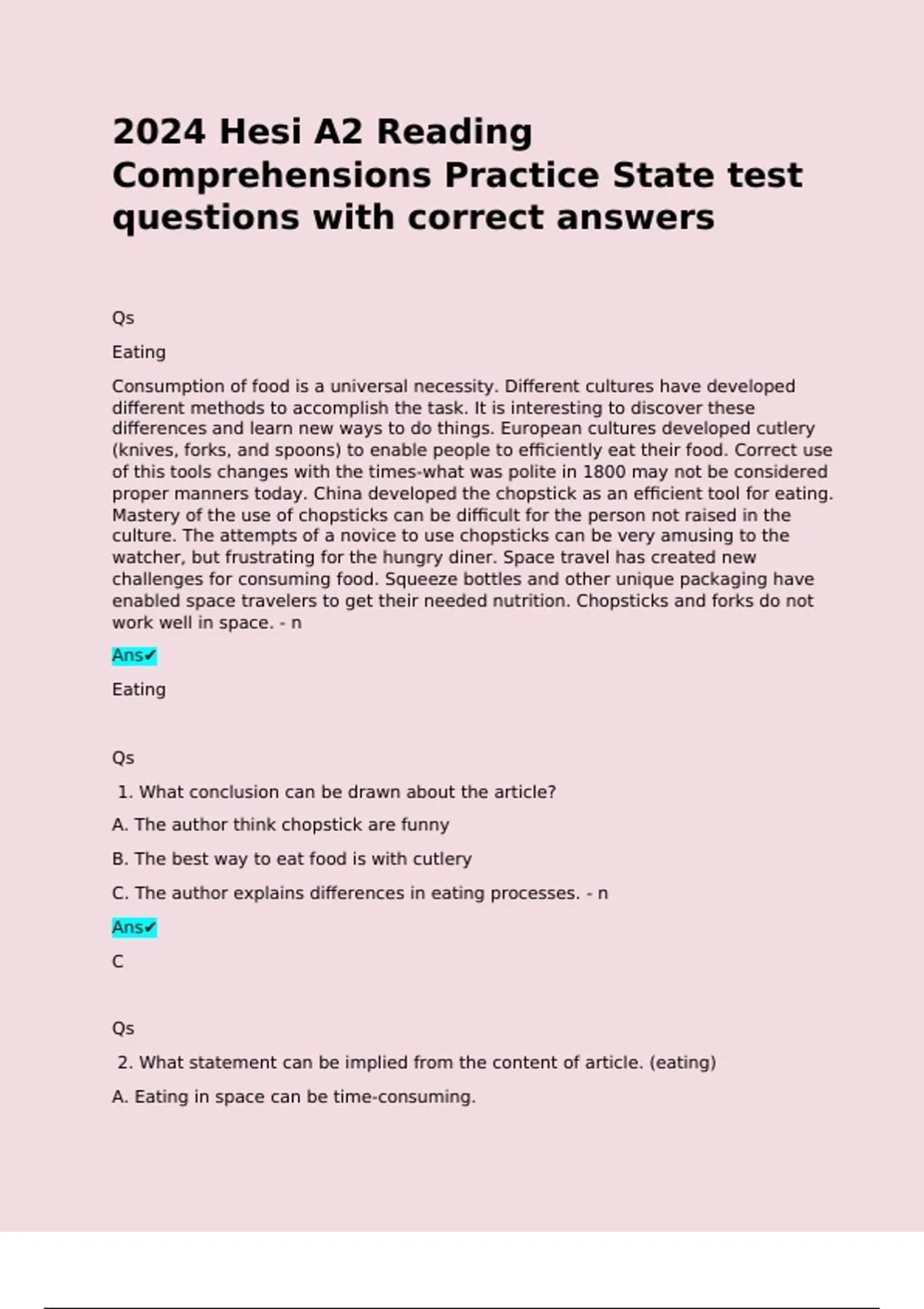 2024 Hesi A2 Reading Comprehensions Practice State test questions with correct answers Qs Eating Consumption of food is a universal necessity. Different cultures have developed different methods to accomplish the task. It is interesting to discover these differences and learn new ways to do things. European cultures developed cutlery (knives, forks, and spoons) to enable people to efficiently eat their food. Correct use of this tools changes with the times-what was polite in 1800 may not be considered proper manners today. China developed the chopstick as an efficient tool for eating. Mastery of the use of chopsticks can be difficult for the person not raised in the culture. The attempts of a novice to use chopsticks can be very amusing to the watcher, but frustrating for the hungry diner. Space travel has created new challenges for consuming food. Squeeze bottles and other unique packaging have enabled space travelers to get their needed nutrition. Chopsticks and forks do not work well in space. - n Ans