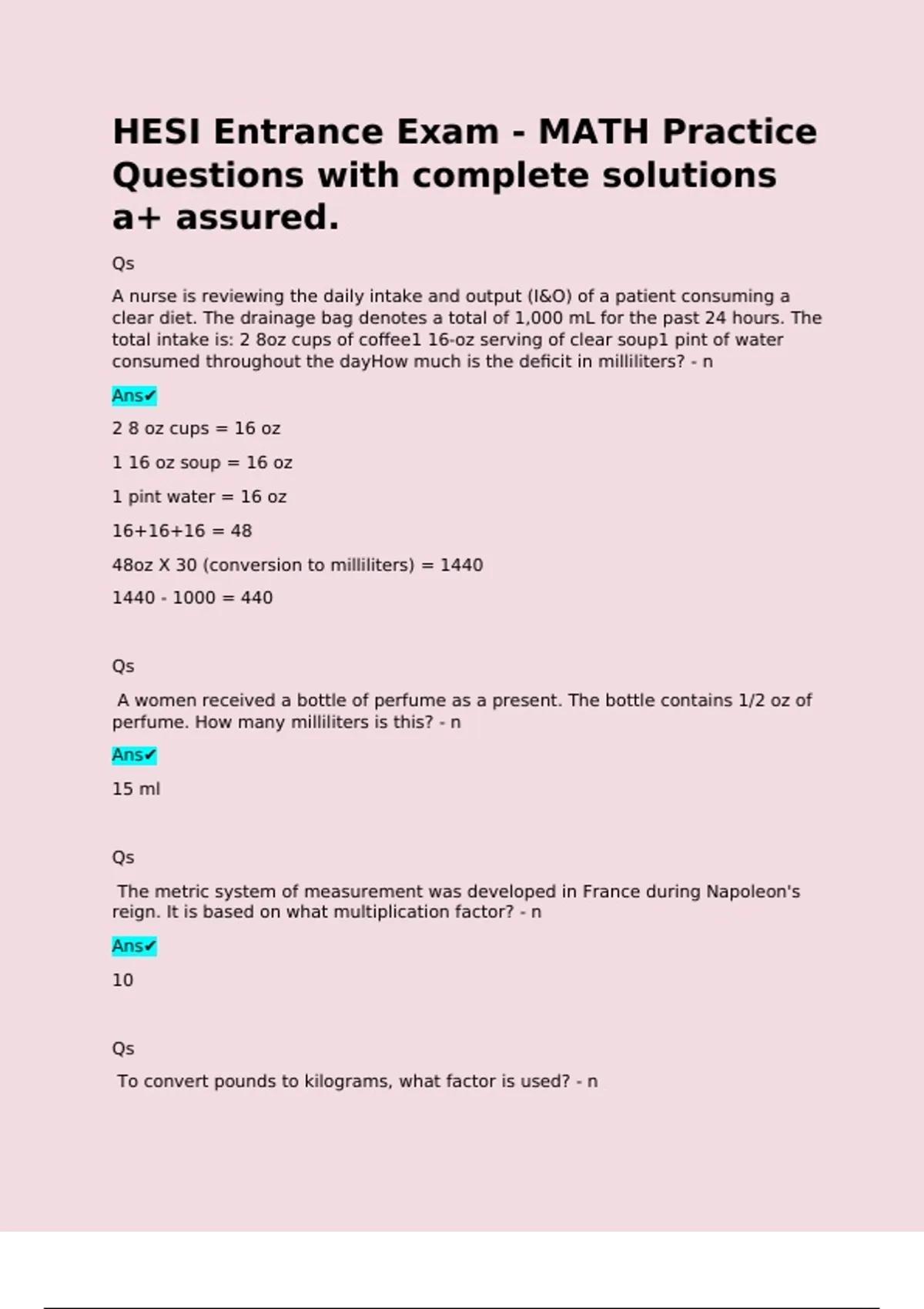 HESI Entrance Exam - MATH Practice Questions with complete solutions a+ assured. Qs A nurse is reviewing the daily intake and output (I&O) of a patient consuming a clear diet. The drainage bag denotes a total of 1,000 mL for the past 24 hours. The total intake is: 2 8oz cups of coffee1 16-oz serving of clear soup1 pint of water consumed throughout the dayHow much is the deficit in milliliters? - n Ans 2 8 oz cups = 16 oz 1 16 oz soup = 16 oz 1 pint water = 16 oz 16+16+16 = 48 48oz X 30 (conversion to milliliters) = 1440 = 440 Qs A women received a bottle of perfume as a present. The bottle contains 1/2 oz of perfume. How many milliliters is this? - n Ans 15 ml Qs The metric system of measurement was developed in France during Napoleon's reign. It is based on what multiplication factor? - n Ans