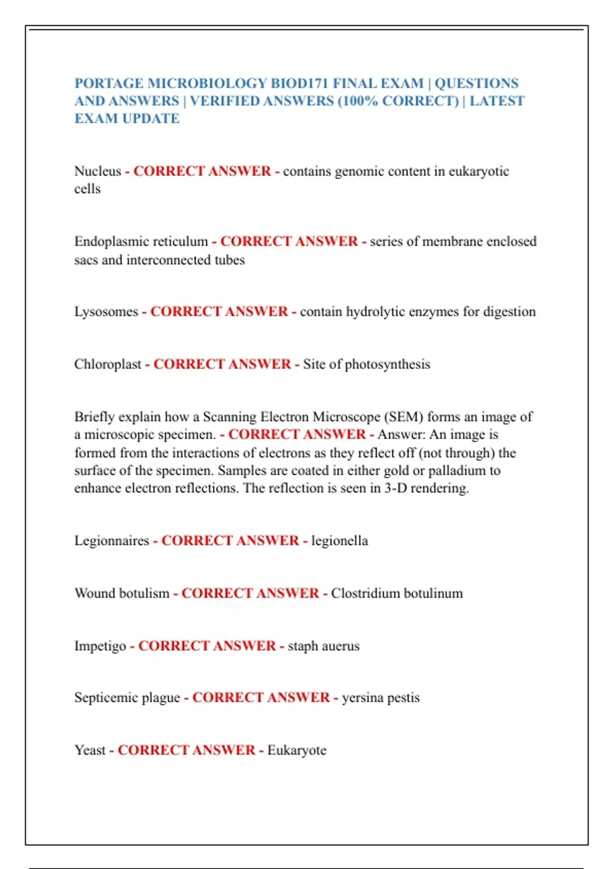 PORTAGE MICROBIOLOGY BIOD171 FINAL EXAM | QUESTIONS AND ANSWERS | VERIFIED ANSWERS (100% CORRECT) | LATEST EXAM UPDATE
