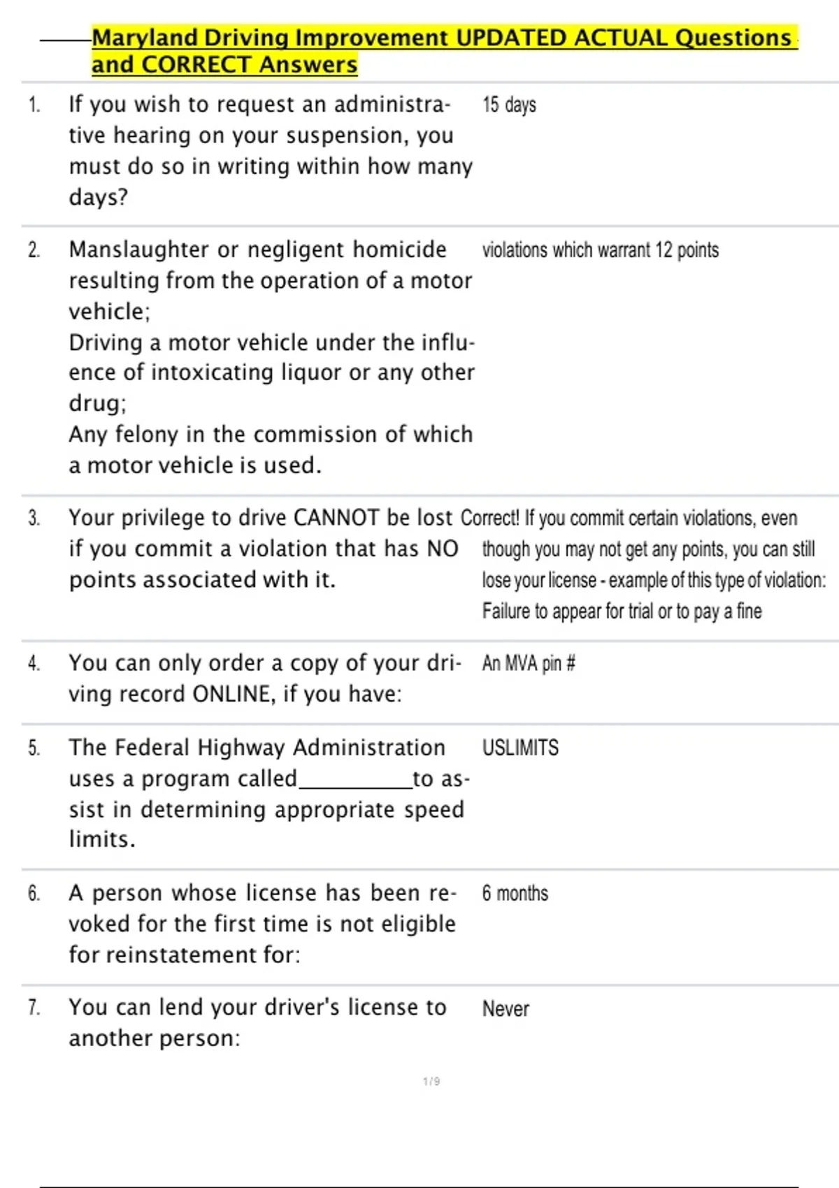 , Maryland Driving Improvement UPDATED ACTUAL Questions