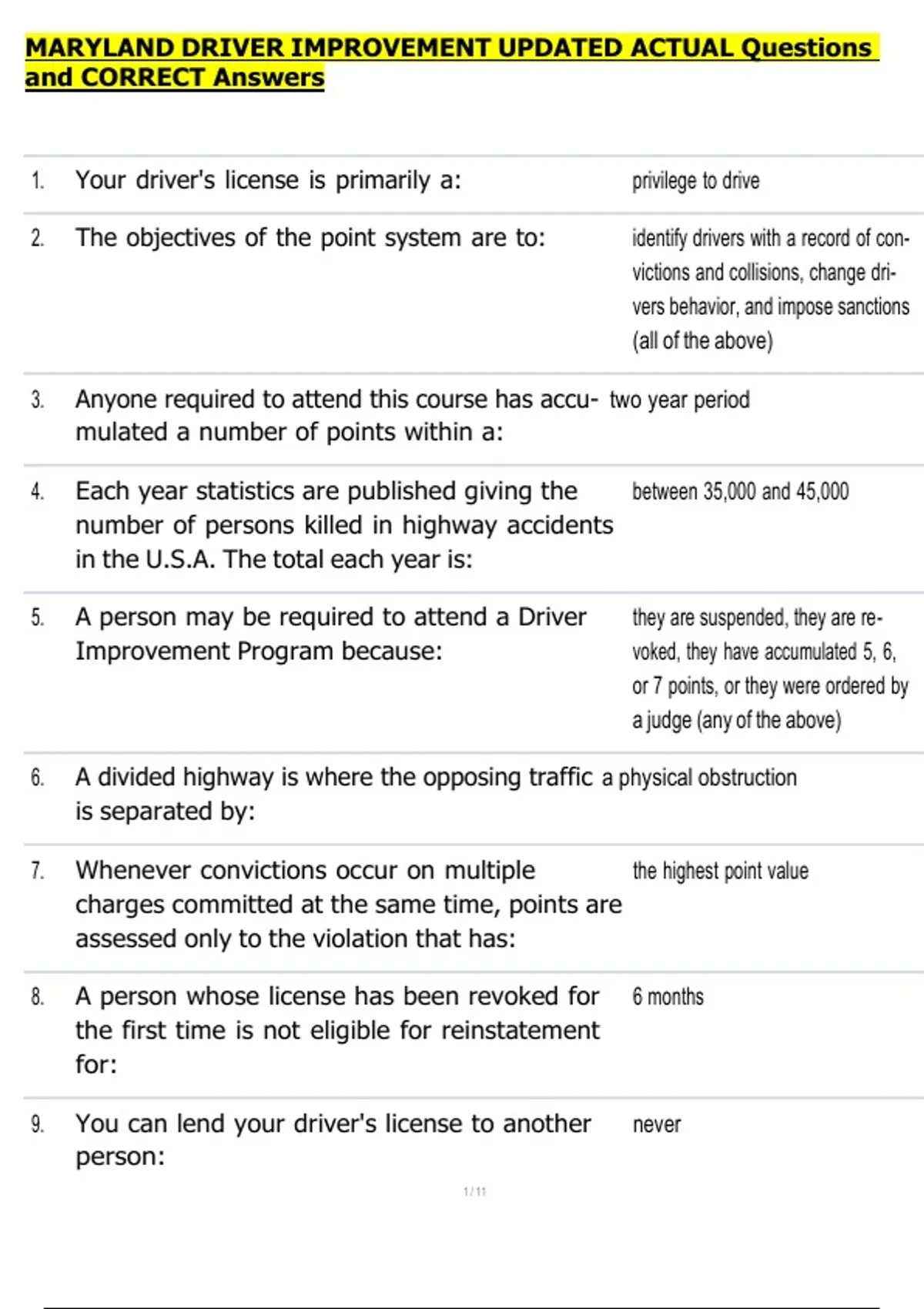 , MARYLAND DRIVER IMPROVEMENT UPDATED ACTUAL Questions