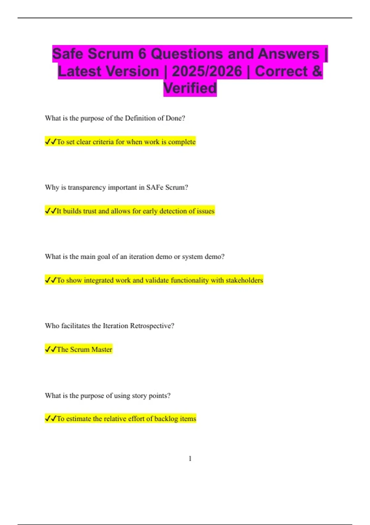 Safe Scrum 6 Questions and Answers | Latest Version | 2025/2026 | Correct & Verified What is the purpose of the Definition of Done? To set clear criteria for when work is complete Why is transparency important in SAFe Scrum? It builds trust and allows for early detection of issues What is the main goal of an iteration demo or system demo? To show integrated work and validate functionality with stakeholders Who facilitates the Iteration Retrospective? The Scrum Master What is the purpose of using story points? To estimate the relative effort of backlog items 2 Why is it important to maintain a prioritized backlog? To ensure the team always works on the most valuable items What is the responsibility of the Scrum Master during PI Planning? To facilitate the process and support team coordination What is the benefit of timeboxed iterations? They provide a predictable rhythm for delivering value How does a Scrum team handle dependencies? By identifying them early and collaborating with other teams What is the purpose of the iteration goal? To provide focus and alignment for the team during the iteration Why is continuous improvement critical in SAFe Scrum? It allows teams to adapt and increase efficiency over time 3 Who provides business context and priorities to the team? The Product Owner What is the main function of a Scrum board? To visualize the workflow and track progress of work items Why should the Scrum Master avoid assigning tasks? To empower the team to self-organize What is a common outcome of a successful iteration? A potentially shippable increment of value What is the primary responsibility of the Scrum Master in SAFe? To facilitate the Scrum process, remove impediments, and coach the team Who owns the team backlog? The Product Owner 4 What is the main purpose of the Daily Standup? To synchronize team activities and identify impediments What is the goal of a Sprint (Iteration) Review? To demonstrate completed work and gather stakeholder feedback What is the key outcome of an Iteration Retrospective? To identify improvements for the next iteration Who ensures the team follows Agile principles and SAFe practices? The Scrum Master
