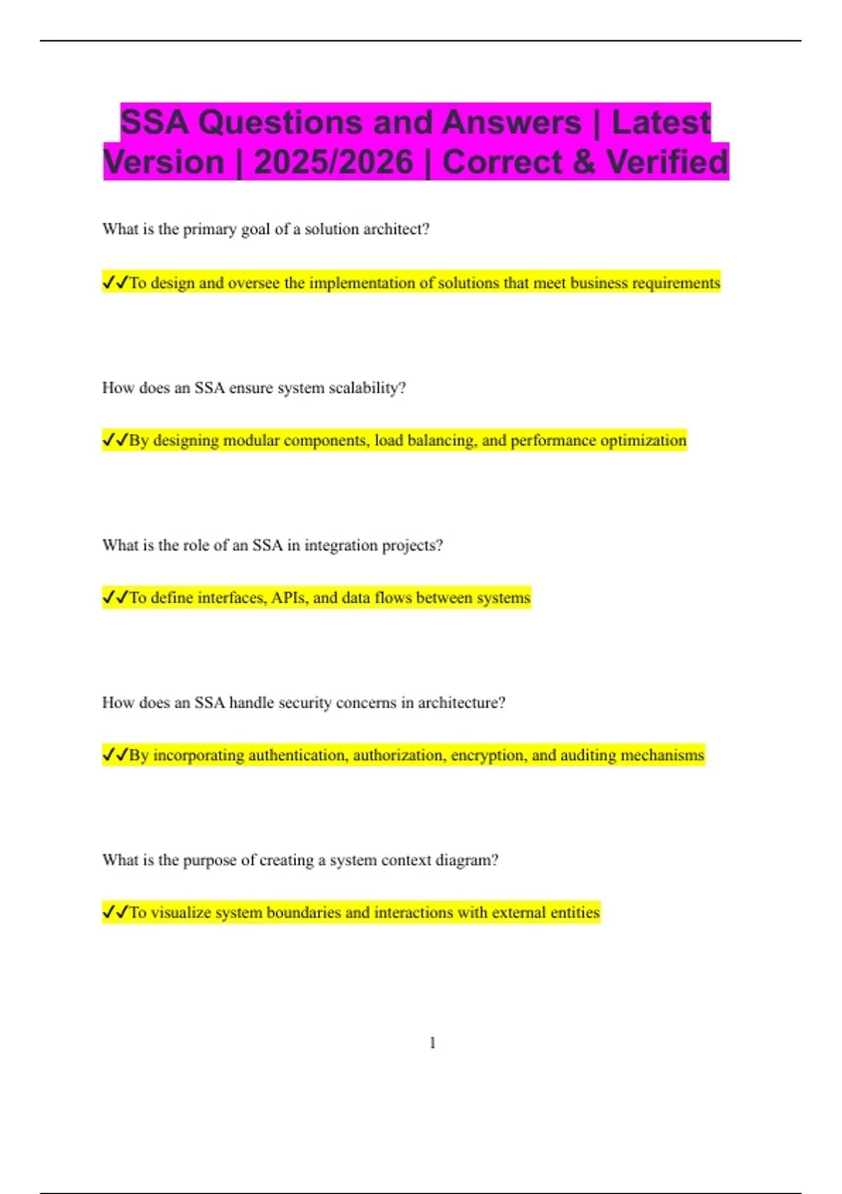 SSA Questions and Answers | Latest Version | 2025/2026 | Correct & Verified What is the primary goal of a solution architect? To design and oversee the implementation of solutions that meet business requirements How does an SSA ensure system scalability? By designing modular components, load balancing, and performance optimization What is the role of an SSA in integration projects? To define interfaces, APIs, and data flows between systems How does an SSA handle security concerns in architecture? By incorporating authentication, authorization, encryption, and auditing mechanisms What is the purpose of creating a system context diagram? To visualize system boundaries and interactions with external entities 2 How does an SSA address performance requirements? By selecting efficient algorithms, optimizing resources, and defining SLAs What is the difference between logical and physical architecture? Logical architecture defines components and relationships; physical architecture defines deployment and infrastructure How does an SSA support maintainability? By designing modular, loosely coupled, and well-documented systems What is the role of architecture patterns in SSA? To provide reusable solutions for common design problems How does an SSA ensure high availability? By designing redundancy, failover mechanisms, and disaster recovery plans What is the purpose of a component diagram? To represent system modules and their dependencies 3 How does an SSA approach data management? By defining data models, storage strategies, and data flow processes What is the role of an SSA in cloud architecture? To design scalable, resilient, and cost-effective cloud solutions How does an SSA manage technical debt? By prioritizing refactoring, modular design, and continuous improvement What is the importance of a reference architecture? To provide standardized guidance and best practices for system design How does an SSA handle cross-cutting concerns? By addressing logging, security, transaction management, and error handling What is the role of an SSA in DevOps practices? To define deployment pipelines, CI/CD processes, and automation strategies 4 How does an SSA evaluate technology choices? By assessing scalability, compatibility, cost, and organizational fit What is the importance of documentation in SSA? To communicate design decisions, patterns, and system behavior clearly How does an SSA ensure system reliability?