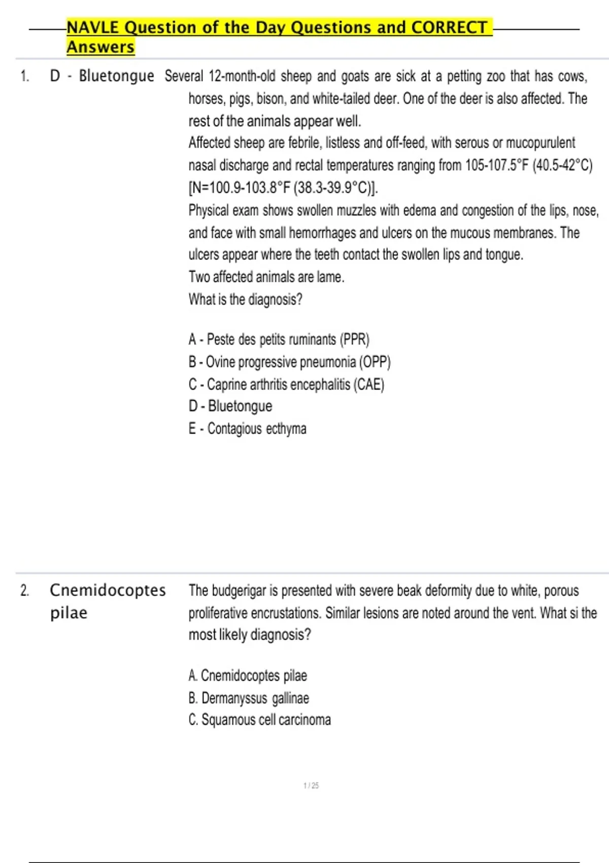 1. D - Bluetongue Several 12-month-old sheep and goats are sick at a petting zoo that has cows,