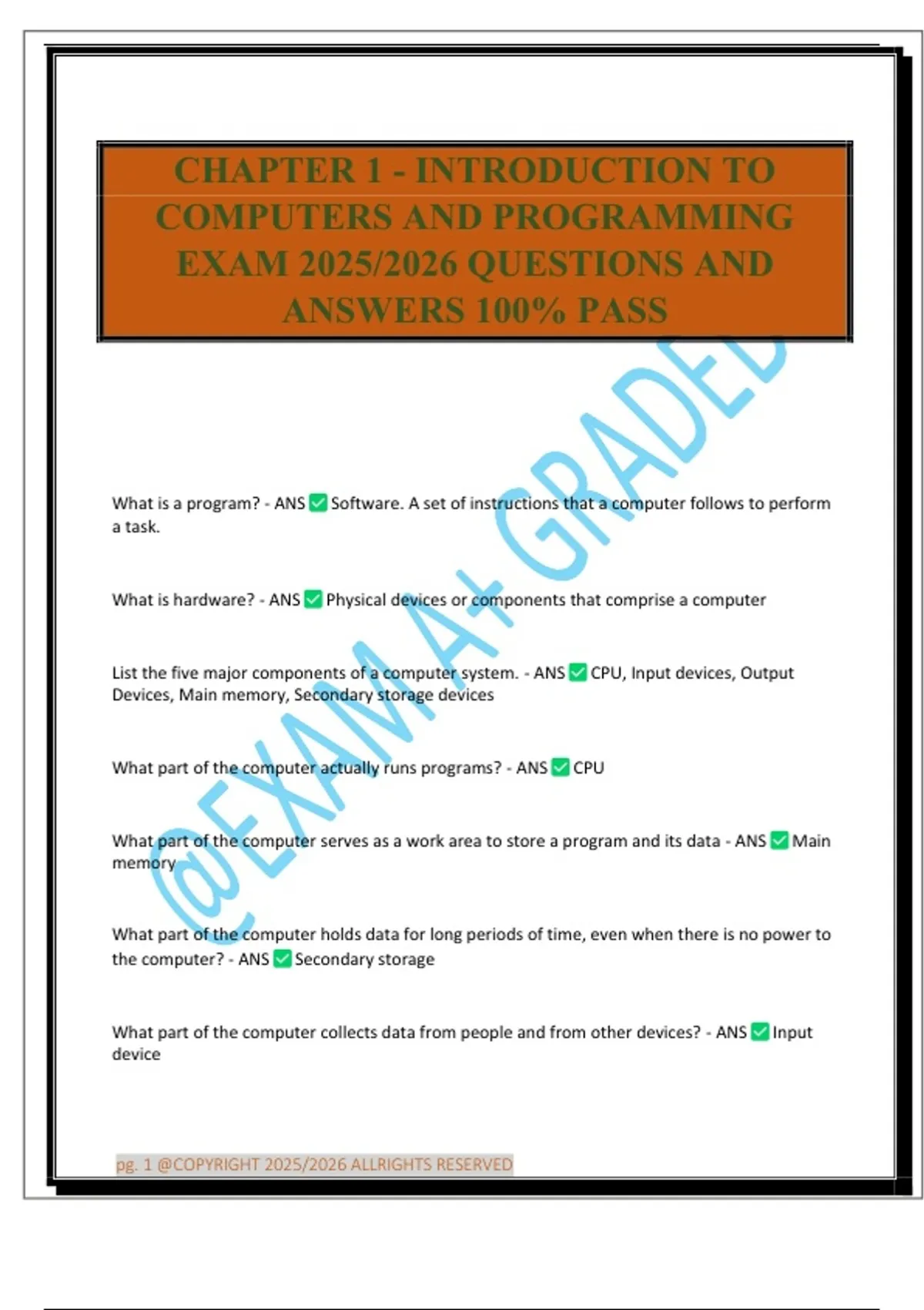 CHAPTER 1 - INTRODUCTION TO COMPUTERS AND PROGRAMMING EXAM 2025/2026 QUESTIONS AND ANSWERS 100% PASS
