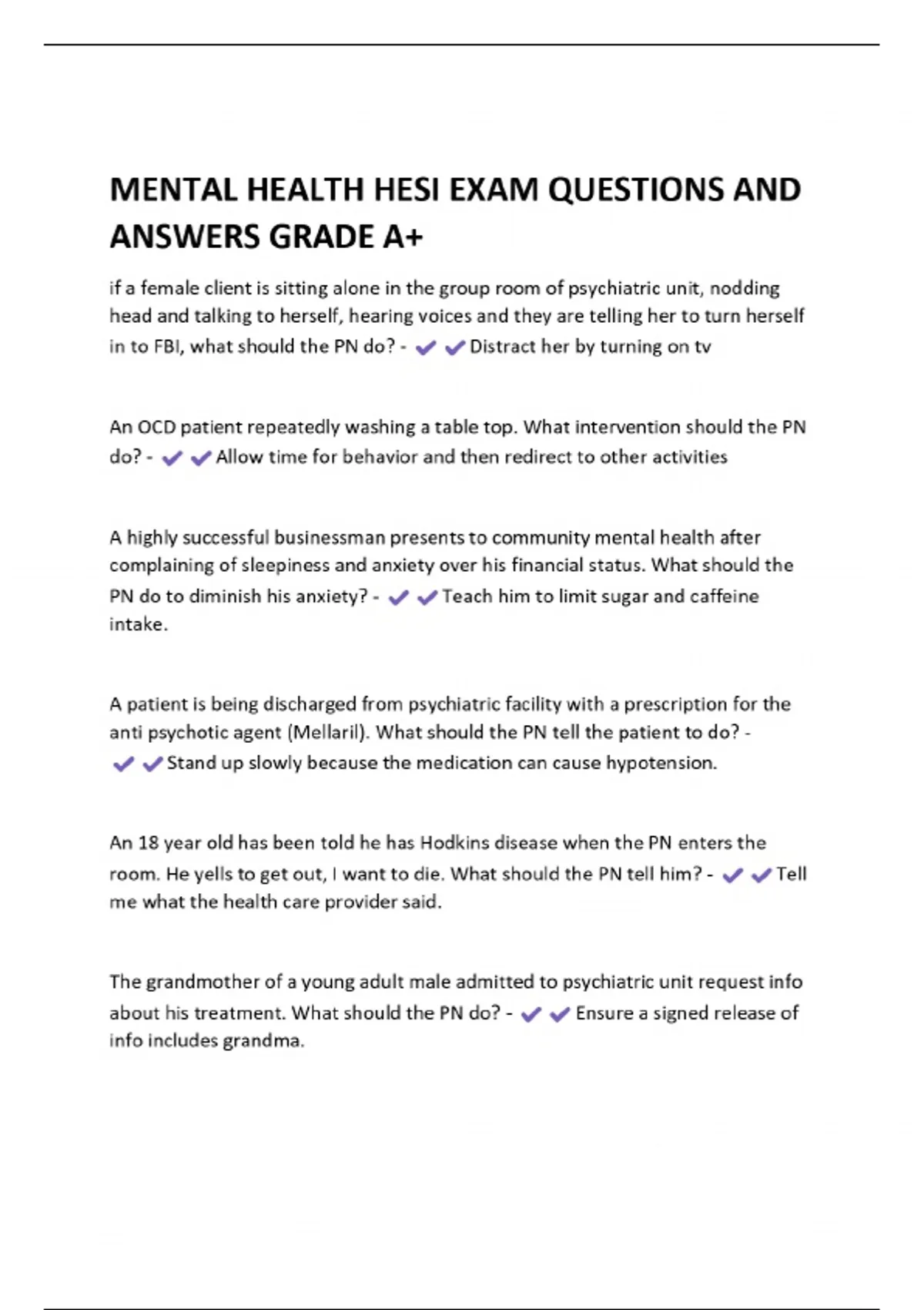 MENTAL HEALTH HESI EXAM QUESTIONS AND ANSWERS GRADE A+