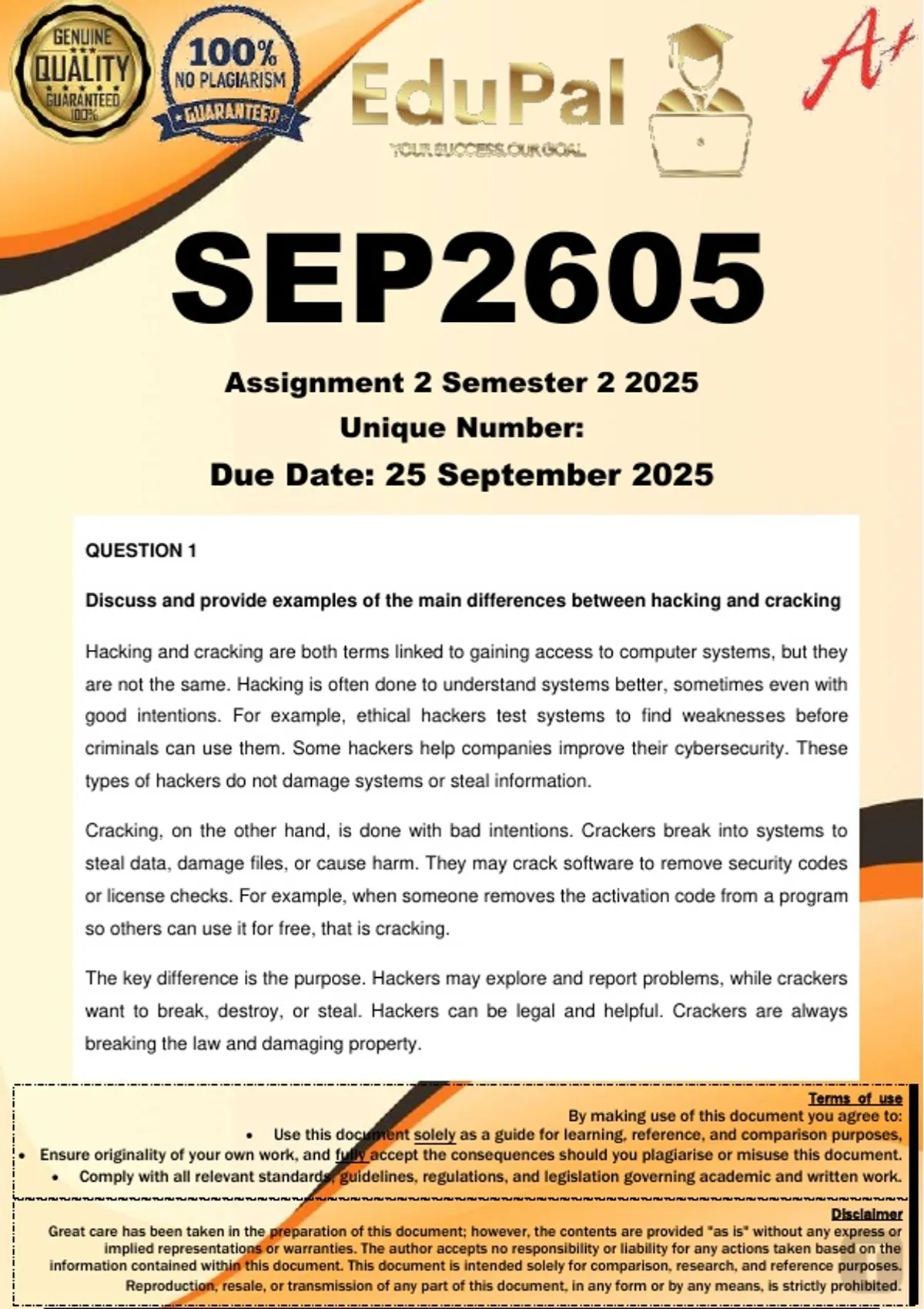 SEP2605 Assignment 2 (COMPLETE ANSWERS) Semester 2 2025 - DUE 25 September 2025; 100% TRUSTED Complete, trusted solutions and explanations. For assistance, Whats-App 0.6.7-1.7.1-1.7.3.9. Ensure your success with us.. Question 1 Discuss and provide examples of the main differences between hacking and cracking. (8) Question 2 Cohen (1995:108-109) defines information as a symbolic representation in its most general sense. Protection is defined as keeping from harm. In the field of information protection, it refers to preventing harm to symbolic representations and the users of the information. Discuss the factors that are basic to information protection. (12) Question 3 Control rooms are at the heart of the security operation. Several issues and challenges are associated with designing a control room. Describe the challenges associated with designing a control room. (5) Question 4 Risk management is the process of assessing risk, taking steps to reduce risk to an acceptable level, and maintaining that level of risk (Blyth & Kovacich, 2006:47). Identify the five principles of risk management. (10) Question 5 A fire is a combustion process in which a fuel reacts with oxygen to give off heat and light. In an essay format, discuss how fires spread, apart from direct burning. (15)