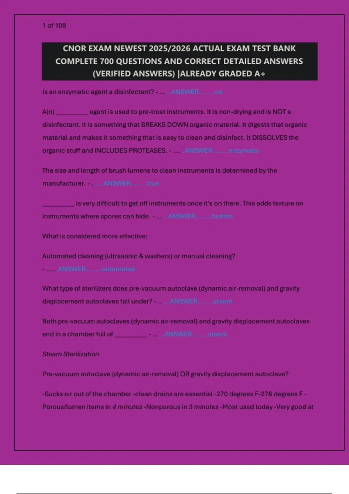 Prepare for the CNOR certification exam with confidence using this comprehensive test bank featuring 700 actual exam questions and verified detailed answers. This guide covers all key topics including sterilization methods, surgical instrumentation, patient safety, infection control, perioperative nursing, and more. Each answer includes thorough explanations to help you understand the rationale and apply critical thinking. Ideal for OR nurses, surgical techs, and anyone preparing for the CNOR exam. Boost your knowledge, improve your test-taking skills, and achieve a top score with this essential resource.