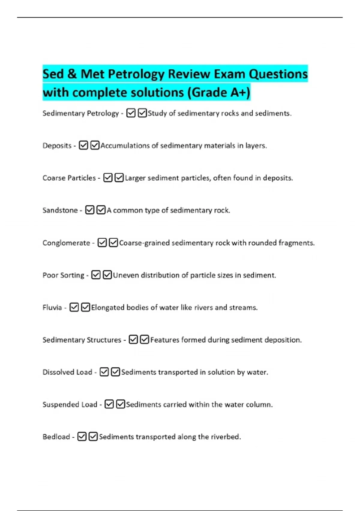 Sed & Met Petrology Review Exam Questions with complete solutions (Grade A+) Sedimentary Petrology - Study of sedimentary rocks and sediments. Deposits - Accumulations of sedimentary materials in layers. Coarse Particles - Larger sediment particles, often found in deposits. Sandstone - A common type of sedimentary rock. Conglomerate - Coarse-grained sedimentary rock with rounded fragments. Poor Sorting - Uneven distribution of particle sizes in sediment.
