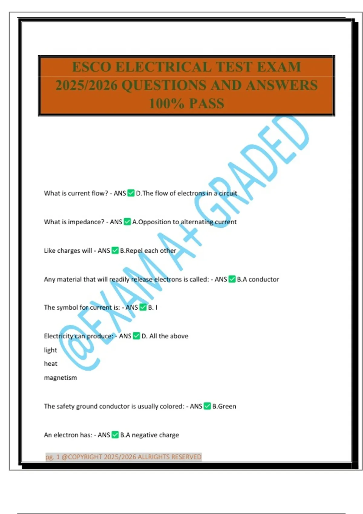 ESCO ELECTRICAL TEST EXAM 2025/2026 QUESTIONS AND ANSWERS 100% PASS