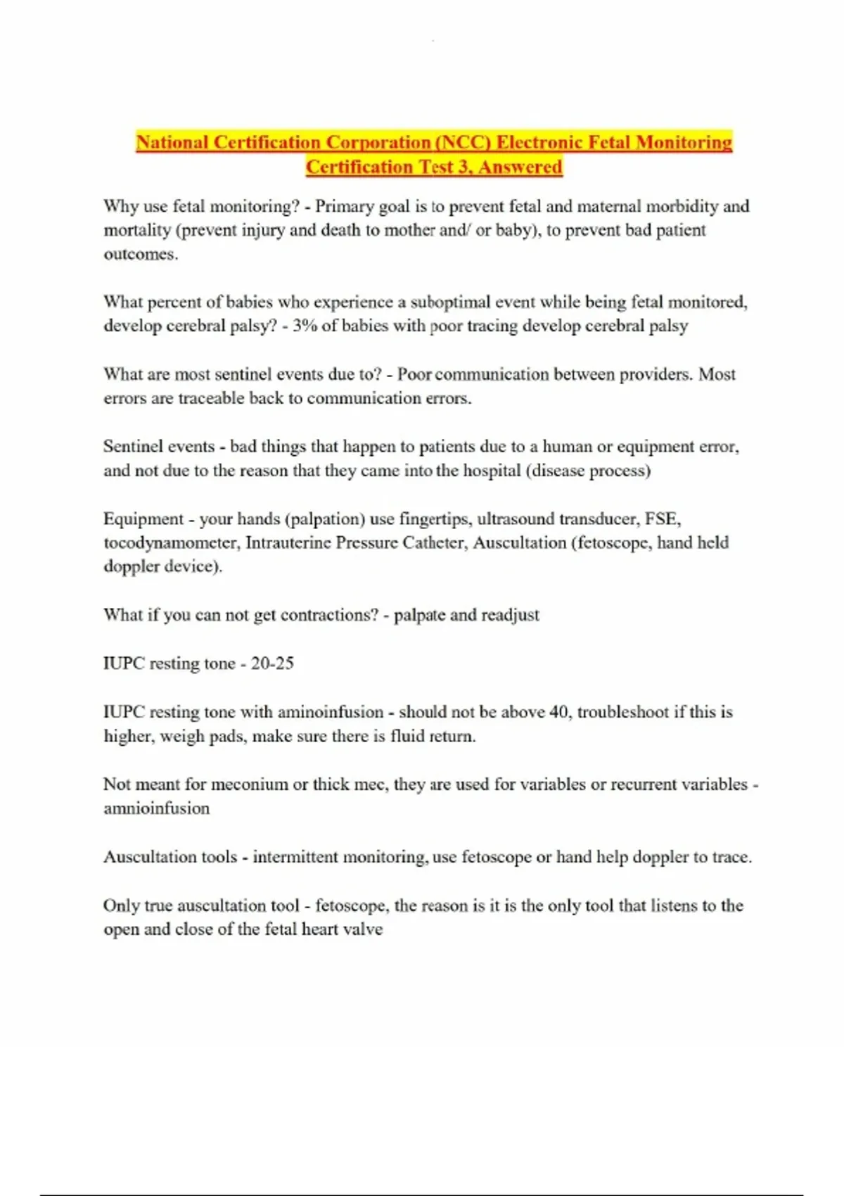 National Certification Corporation (NCC) Electronic Fetal Monitoring Certification Test 3, Answered-Why use fetal monitoring? - Primary goal is to prevent fetal and maternal morbidity and mortality (prevent injury and death to mother and/ or baby), to prevent bad patient outcomes. What percent of babies who experience a suboptimal event while being fetal monitored, develop cerebral palsy? - 3% of babies with poor tracing develop cerebral palsy What are most sentinel events due to? - Poor communication between providers. Most errors are traceable back to communication errors. Sentinel events - bad things that happen to patients due to a human or equipment error, and not due to the reason that they came into the hospital (disease process) Equipment - your hands (palpation) use fingertips, ultrasound transducer, FSE, tocodynamometer, Intrauterine Pressure Catheter, Auscultation (fetoscope, hand held doppler device). What if you can not get contractions? - palpate and readjust IUPC resting tone - 20-25 IUPC resting tone with aminoinfusion - should not be above 40, troubleshoot if this is higher, weigh pads, make sure there is fluid return. Not meant for meconium or thick mec, they are used for variables or recurrent variables - amnioinfusion Auscultation tools - intermittent monitoring, use fetoscope or hand help doppler to trace. Only true auscultation tool - fetoscope, the reason is it is the only tool that listens to the open and close of the fetal heart valve Using the doppler or fetoscope - count the FHR before, during, and after a contraction. Document the baseline rate (range), regular vs irregular, increases or decreases. Do NOT document variability, accels, or decels doppler category 1 - normal FHR baseline, regular rhythm, presence of increases from FHR baseline, no decreases from baseline doppler category 2 - includes ANY of the following: irregular rhythm, presence of FHR decreases, tachycardia, bradycardia (i feel the need to intervene, I feel like I can't walk out of the room)