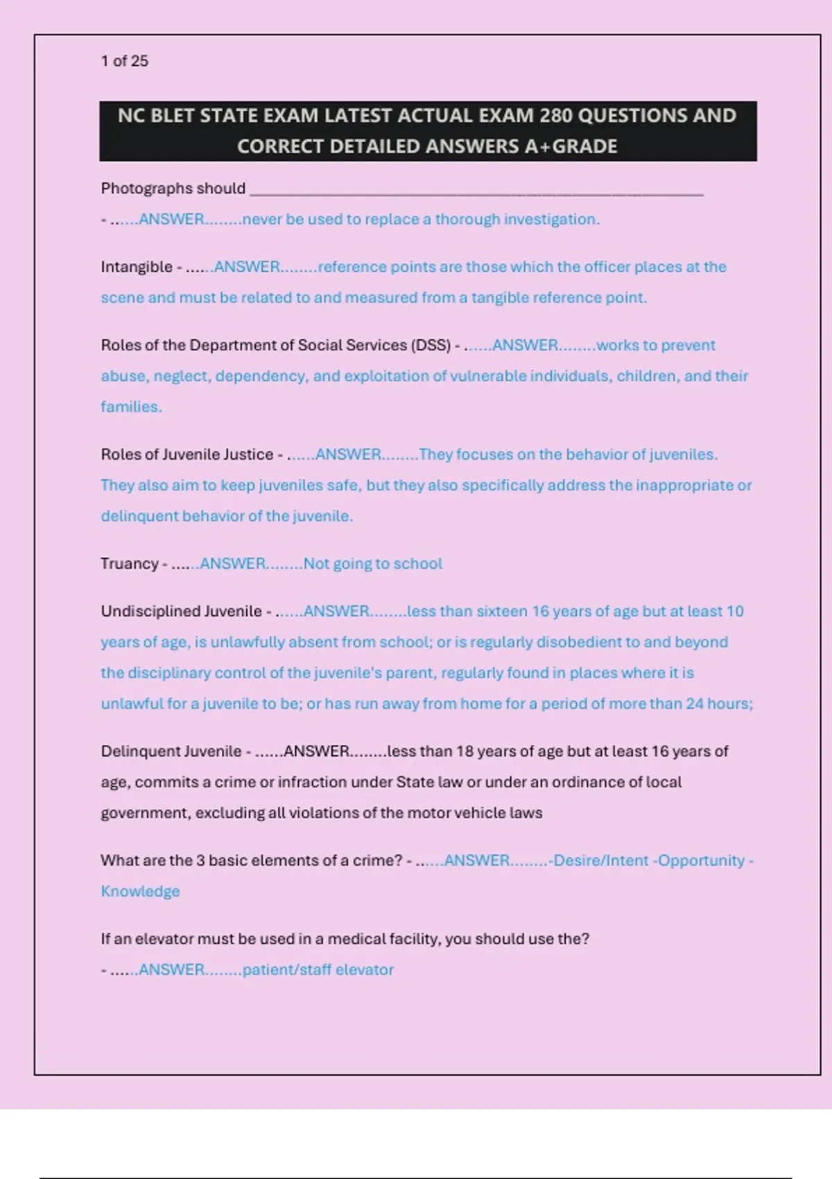 NC BLET STATE EXAM LATEST ACTUAL EXAM 280 QUESTIONS AND