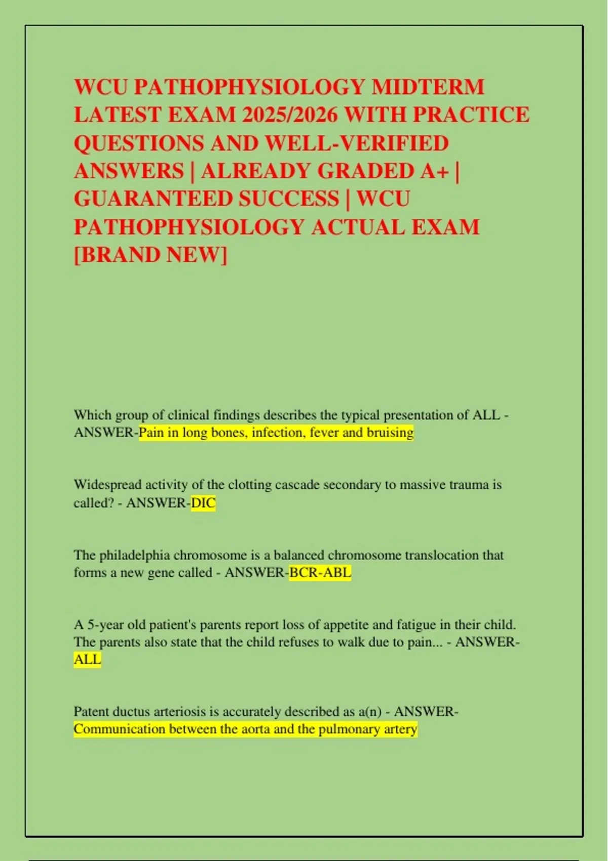 WCU PATHOPHYSIOLOGY MIDTERM LATEST EXAM 2025/2026 WITH PRACTICE QUESTIONS AND WELL-VERIFIED ANSWERS | ALREADY GRADED A+ | GUARANTEED SUCCESS | WCU PATHOPHYSIOLOGY ACTUAL EXAM [BRAND NEW] Which group of clinical findings describes the typical presentation of ALL - ANSWER-Pain in long bones, infection, fever and bruising Widespread activity of the clotting cascade secondary to massive trauma is called? - ANSWER-DIC The philadelphia chromosome is a balanced chromosome translocation that forms a new gene called - ANSWER-BCR-ABL A 5-year old patient's parents report loss of appetite and fatigue in their child. The parents also state that the child refuses to walk due to pain... - ANSWER ALL Patent ductus arteriosis is accurately described as a(n) - ANSWER Communication between the aorta and the pulmonary artery While hospitalized, an elderly patient with a history of myocardial infarction was noted to have high levels of low-density lipoprotein (LDLs). What is the significance of this finding? - ANSWER-Risk of coronary artery disease Hypertension with a specific, identifiable cause is known as ____ hypertension - ANSWER-Secondary