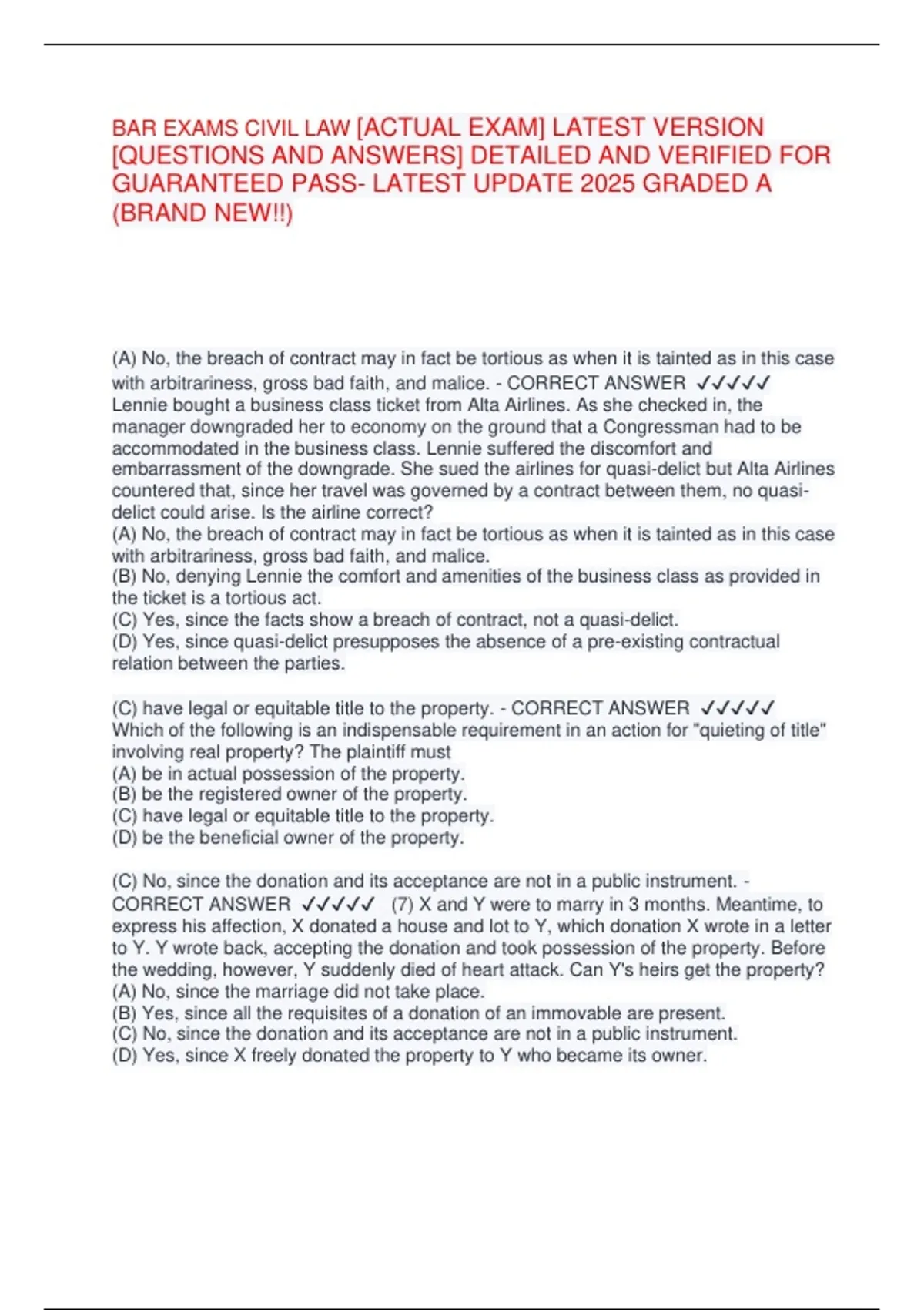 BAR EXAMS CIVIL LAW -ACTUAL EXAM- LATEST VERSION -QUESTIONS AND ANSWERS BAR EXAMS CIVIL LAW -ACTUAL EXAM- LATEST VERSION -QUESTIONS AND ANSWERS BAR EXAMS CIVIL LAW -ACTUAL EXAM- LATEST VERSION -QUESTIONS AND ANSWERS