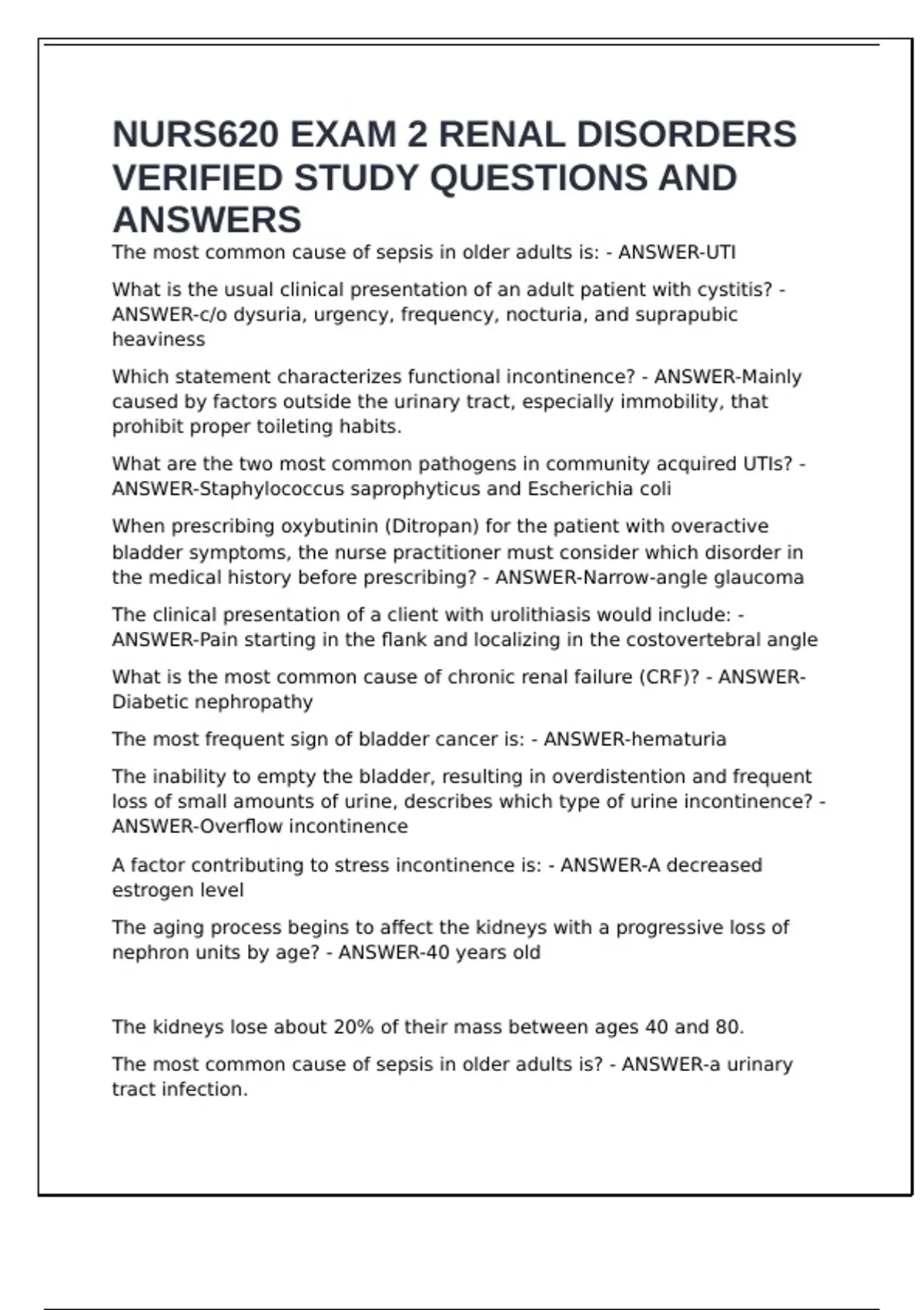 NURS620 EXAM 2 RENAL DISORDERS VERIFIED STUDY QUESTIONS AND ANSWERS