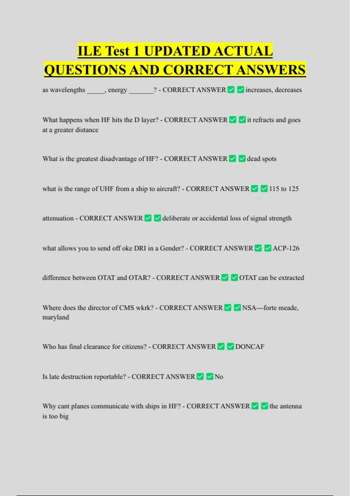 ILE Test 1 UPDATED ACTUAL QUESTIONS AND CORRECT ANSWERS as wavelengths _____, energy _______? - CORRECT ANSWER What happens when HF hits the D layer? - CORRECT ANSWER at a greater distance What is the greatest disadvantage of HF? - CORRECT ANSWER increases, decreases it refracts and goes dead spots what is the range of UHF from a ship to aircraft? - CORRECT ANSWER attenuation - CORRECT ANSWER 115 to 125 deliberate or accidental loss of signal strength what allows you to send off oke DRI in a Gender? - CORRECT ANSWER difference between OTAT and OTAR? - CORRECT ANSWER ACP-126