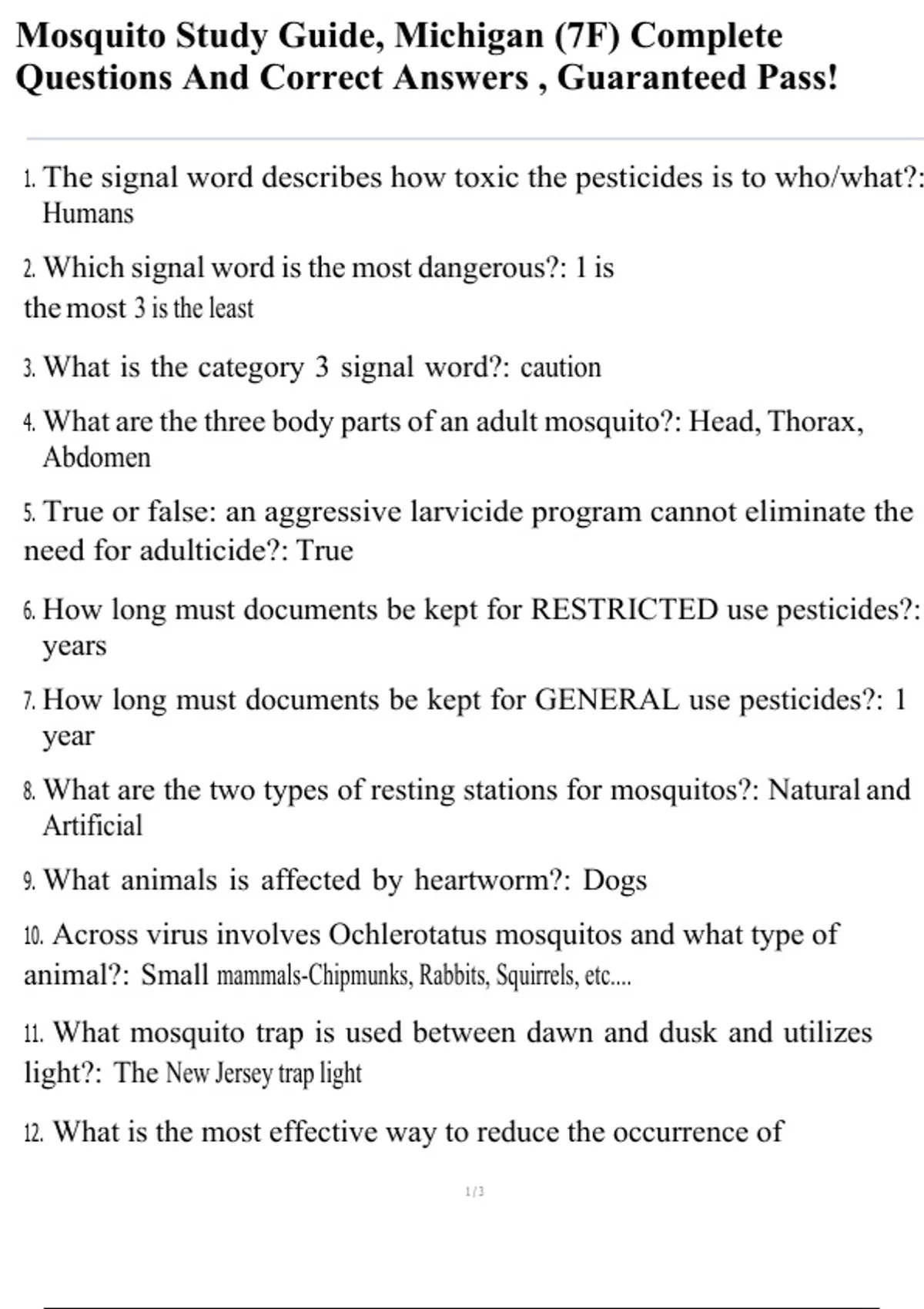 Mosquito Study Guide, Michigan (7F) Complete Questions And Correct Answers , Guaranteed Pass!