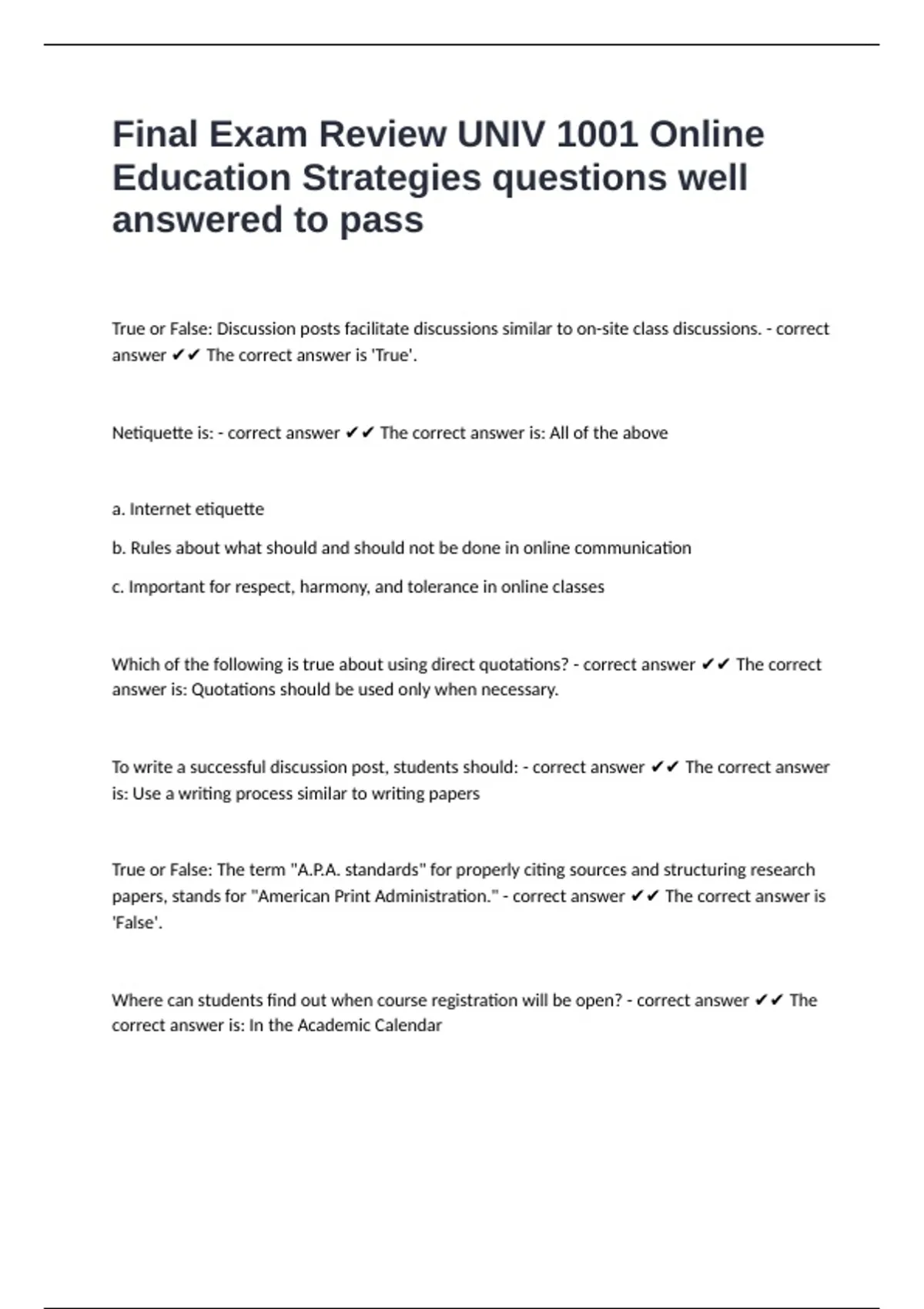 Final Exam Review UNIV 1001 Online Education Strategies questions well answered to pass