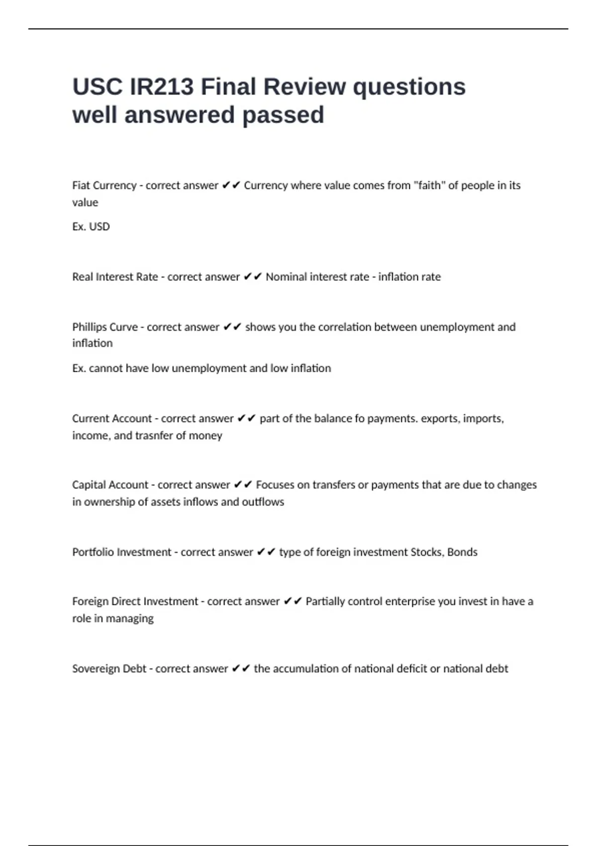 Portfolio Investment - correct answer ✔✔ type of foreign investment Stocks, Bonds