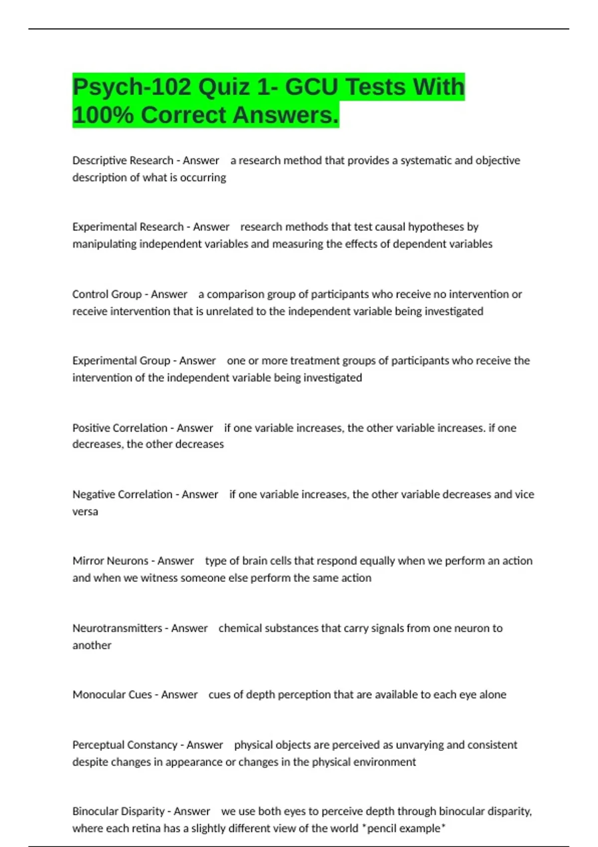 Psych-102 Quiz 1- GCU Tests With 100% Correct Answers.