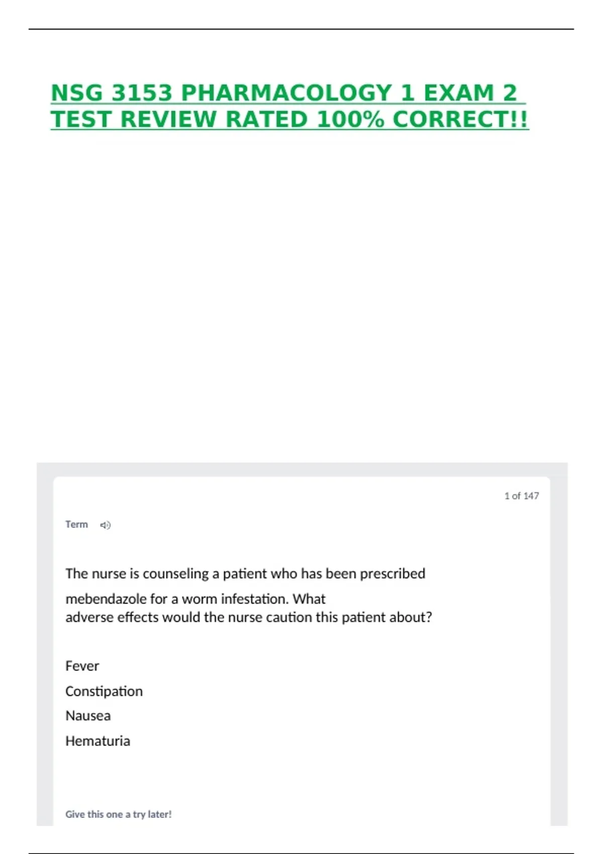 NSG 3153 PHARMACOLOGY 1 EXAM 2 TEST REVIEW RATED 100% CORRECT!!
