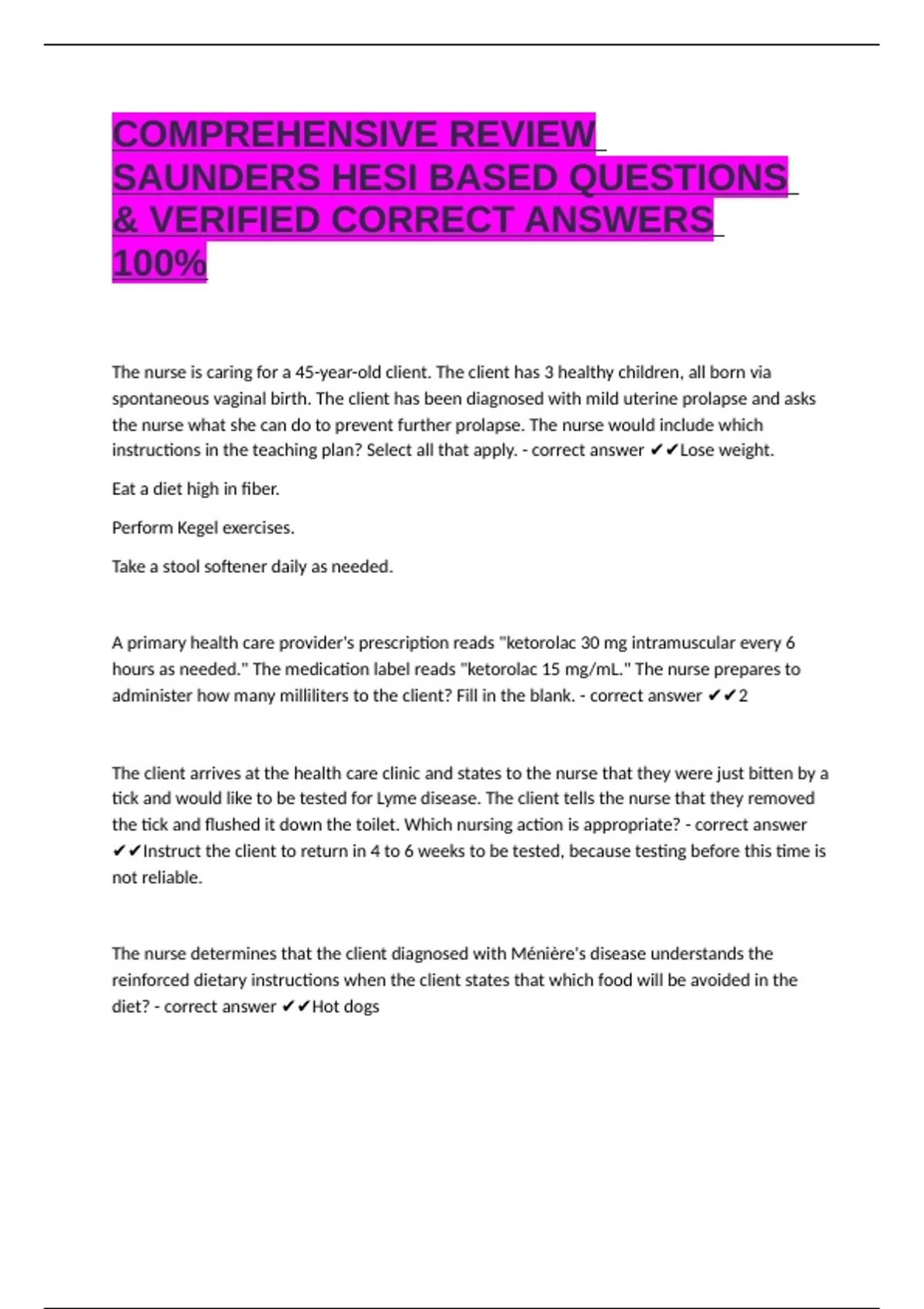 COMPREHENSIVE REVIEW SAUNDERS HESI BASED QUESTIONS & VERIFIED CORRECT ANSWERS 100% Covers all major nursing topics tested on the NCLEX, including medical-surgical, pediatrics, maternity, psychiatric/mental health, pharmacology, and nursing fundamentals. Content is organized in a way that is easy to digest, with summaries, charts, illustrations, and memory aids.
