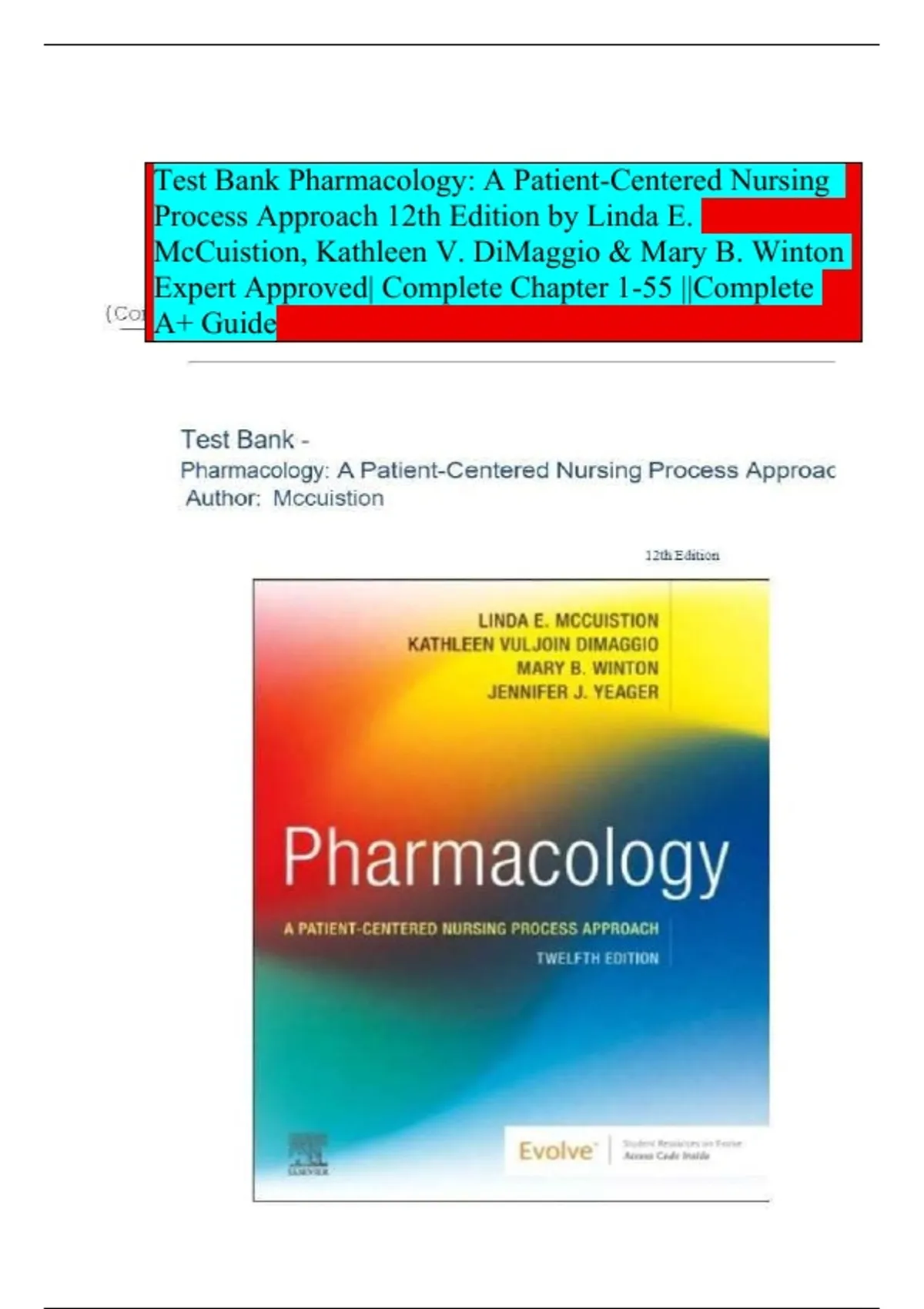 Test Bank Pharmacology: A Patient-Centered Nursing Process Approach 12th Edition by Linda E. McCuistion, Kathleen V. DiMaggio & Mary B. Winton Expert Approved| Complete Chapter 1-55 ||Complete A+ Guide