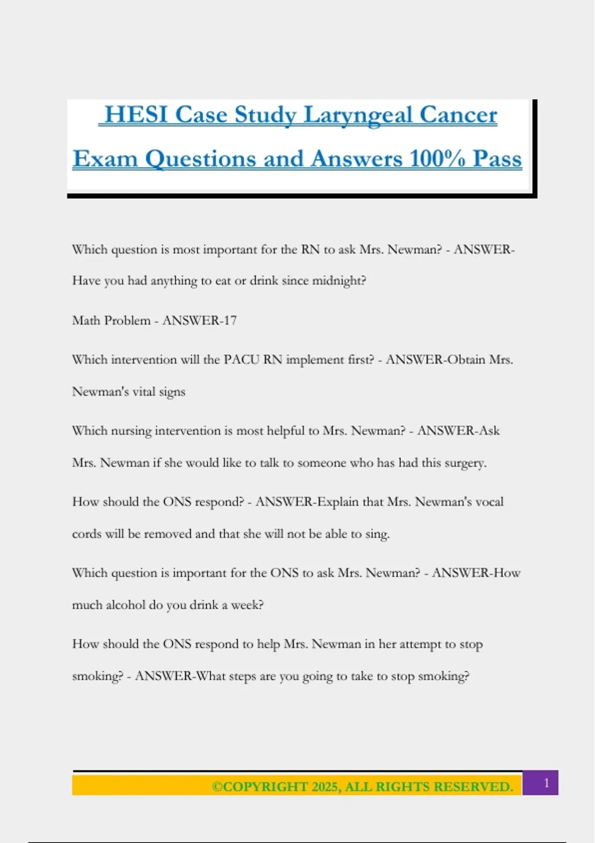 HESI Case Study Laryngeal Cancer Exam Questions and Answers 100% Pass