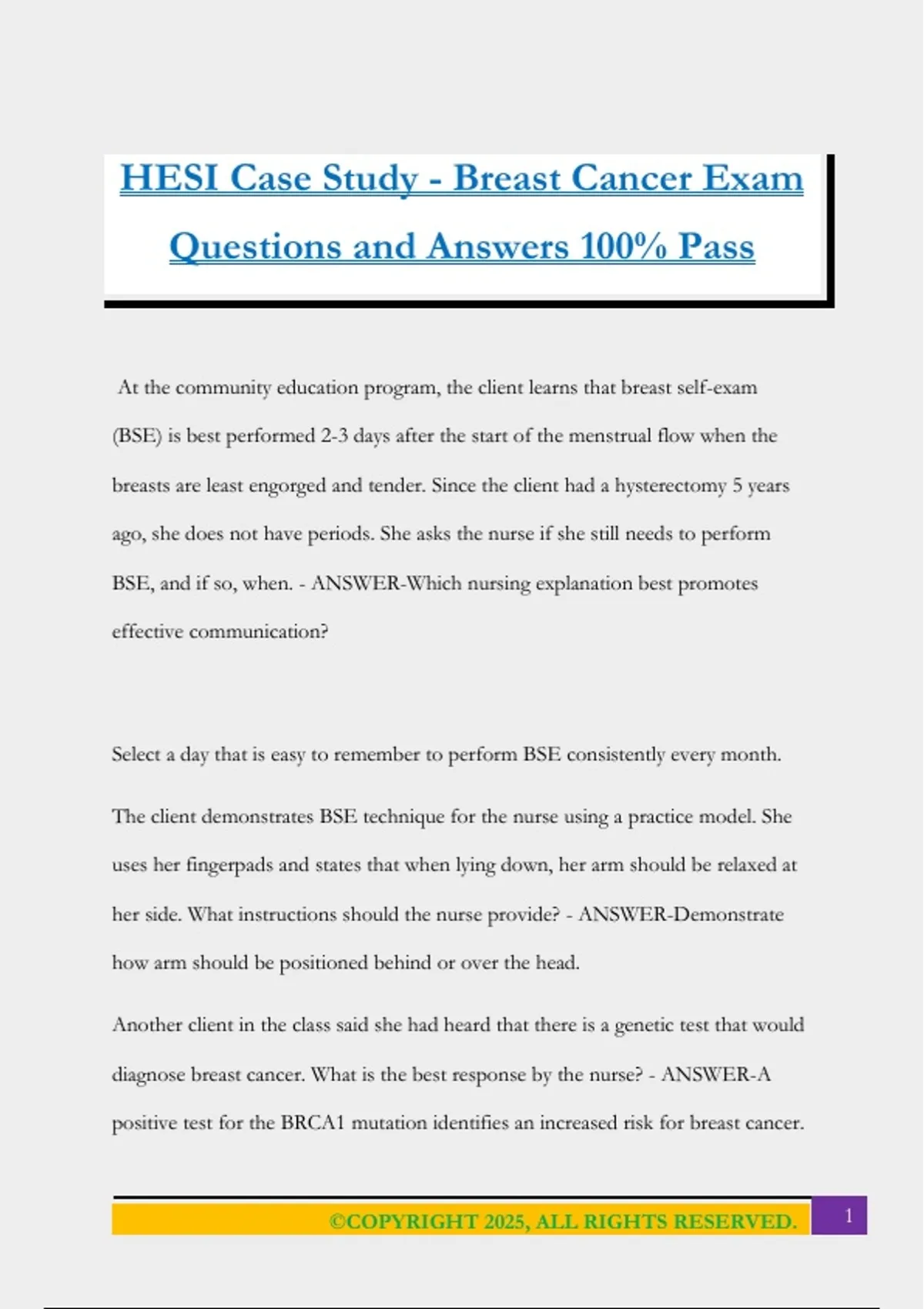 BSE, and if so, when. - ANSWER-Which nursing explanation best promotes