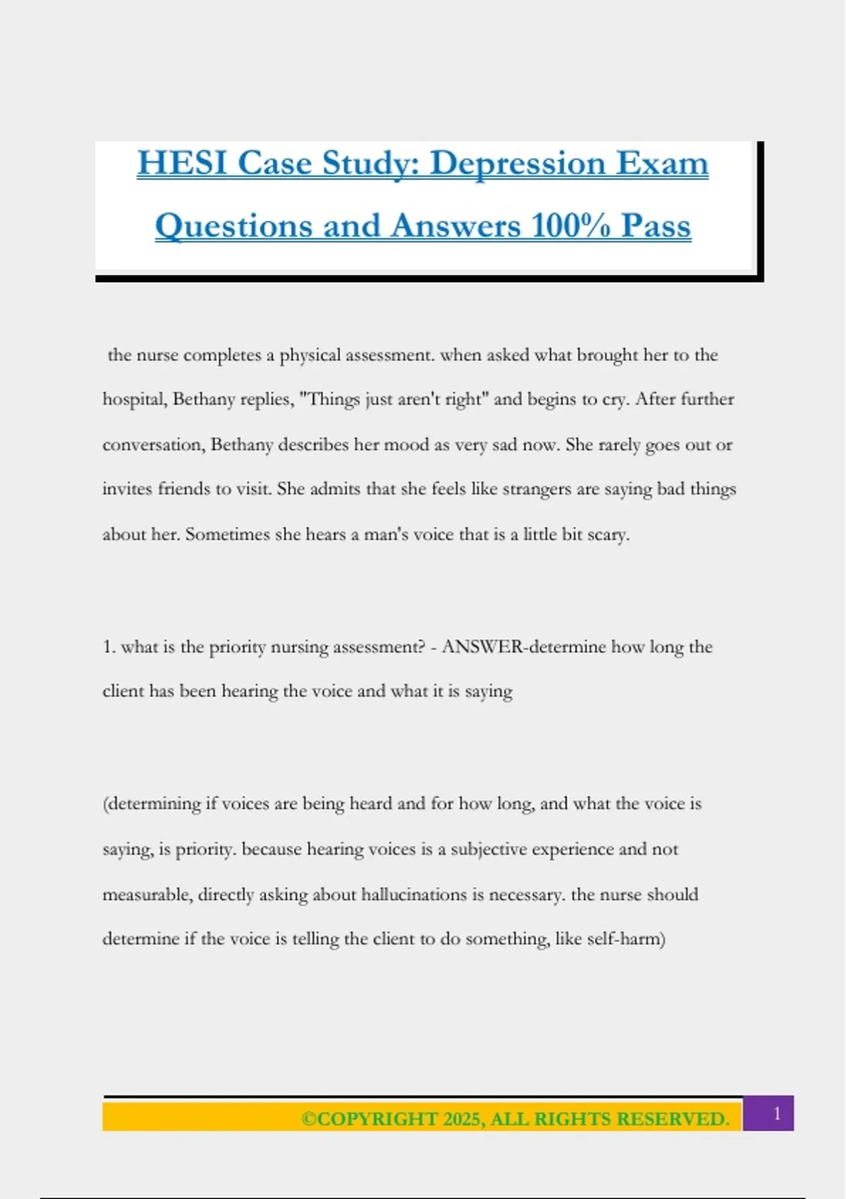 HESI Case Study: Depression Exam Questions and Answers 100% Pass