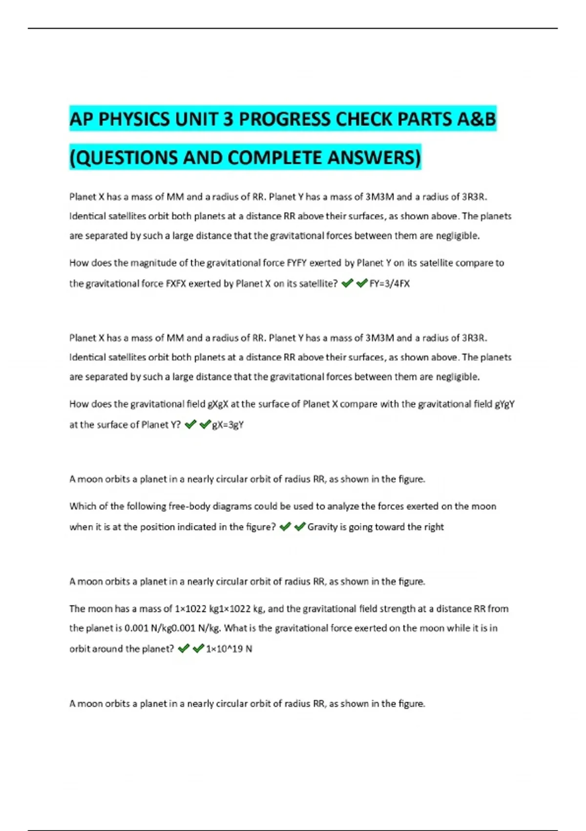 AP PHYSICS UNIT 3 PROGRESS CHECK PARTS A&B (QUESTIONS AND COMPLETE ANSWERS) Planet X has a mass of MM and a radius of RR. Planet Y has a mass of 3M3M and a radius of 3R3R. Identical satellites orbit both planets at a distance RR above their surfaces, as shown above. The planets are separated by such a large distance that the gravitational forces between them are negligible. How does the magnitude of the gravitational force FYFY exerted by Planet Y on its satellite compare to the gravitational force FXFX exerted by Planet X on its satellite? FY=3/4FX