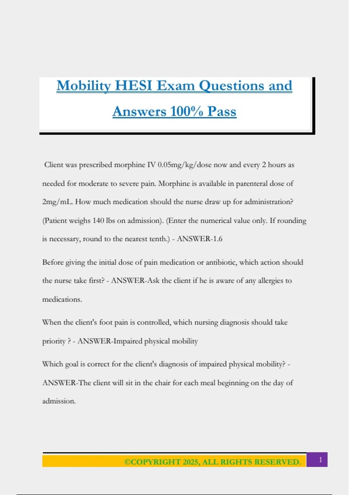 Mobility HESI Exam Questions and Answers 100% Pass